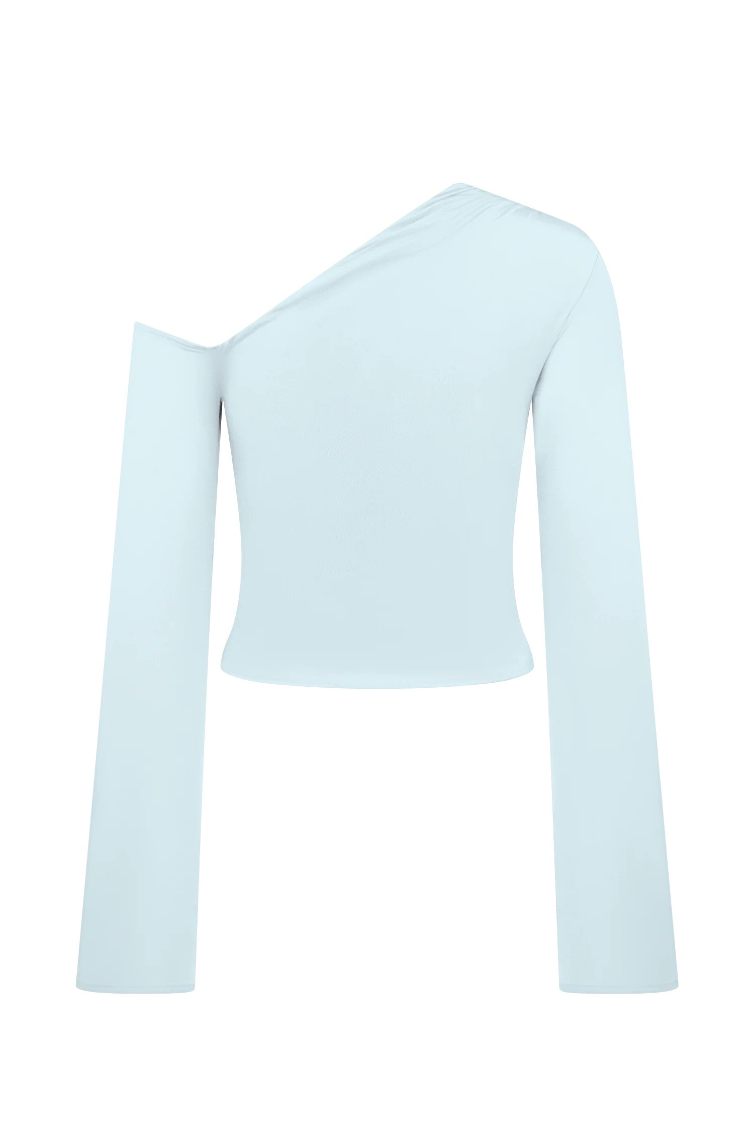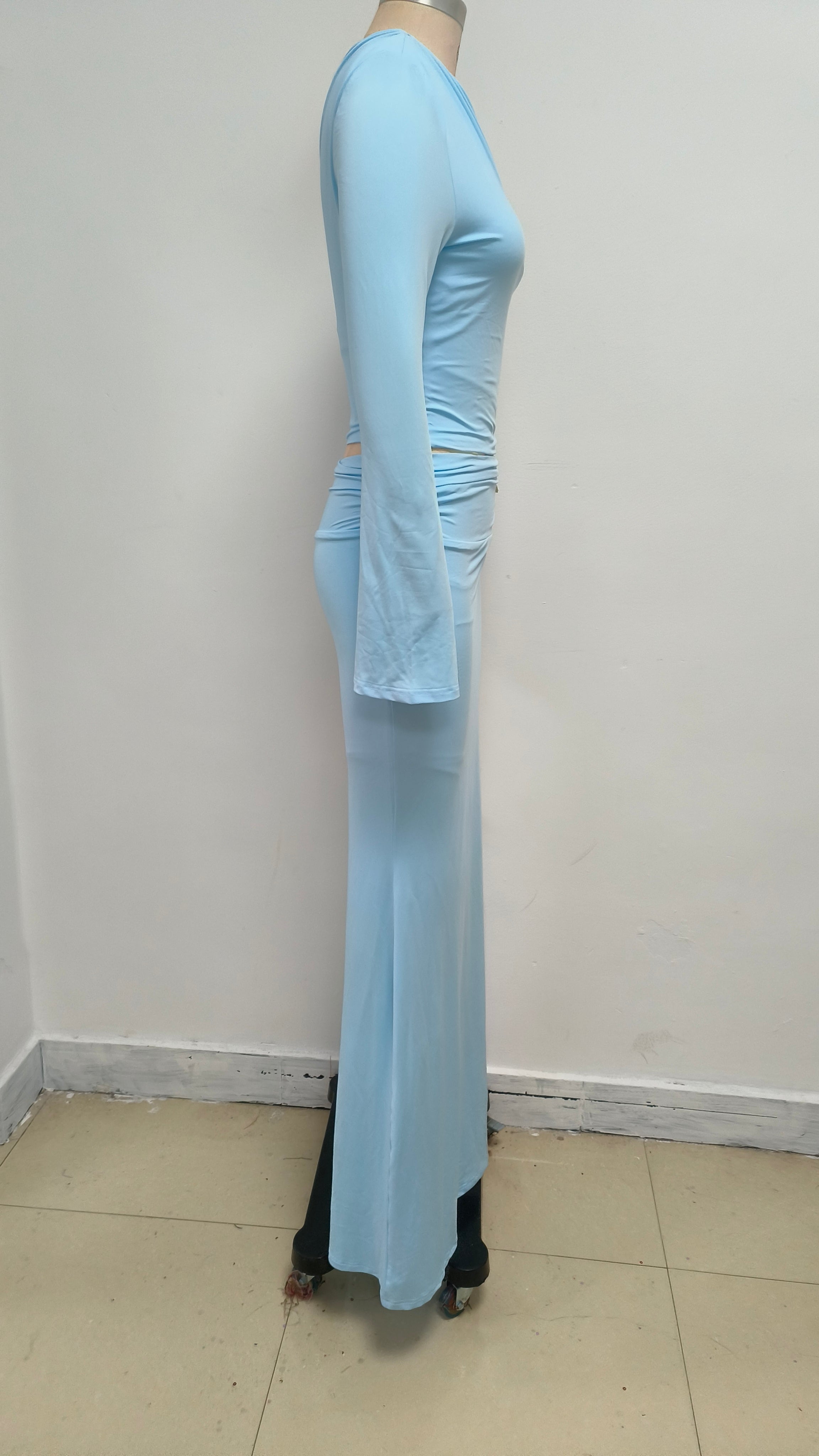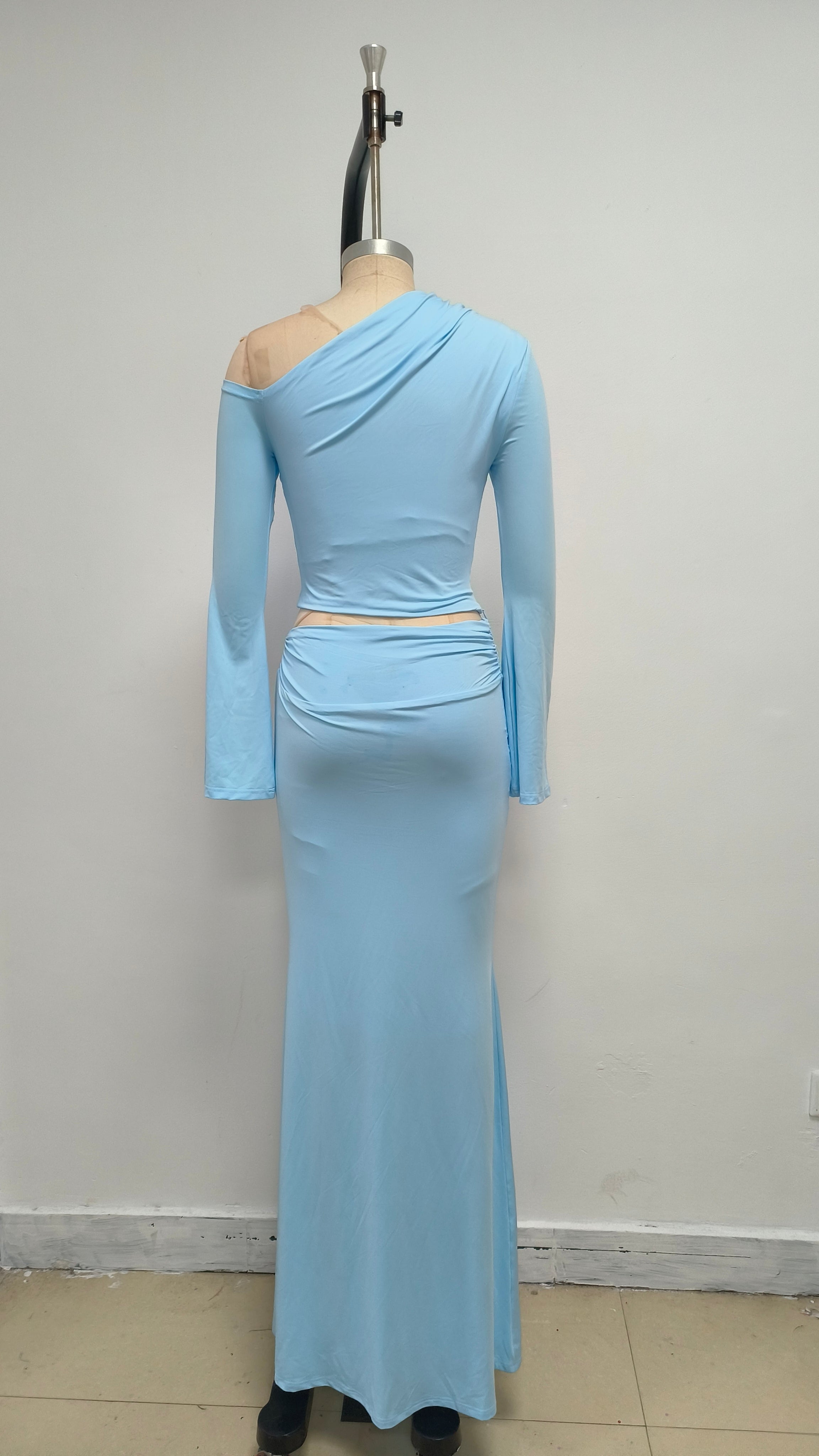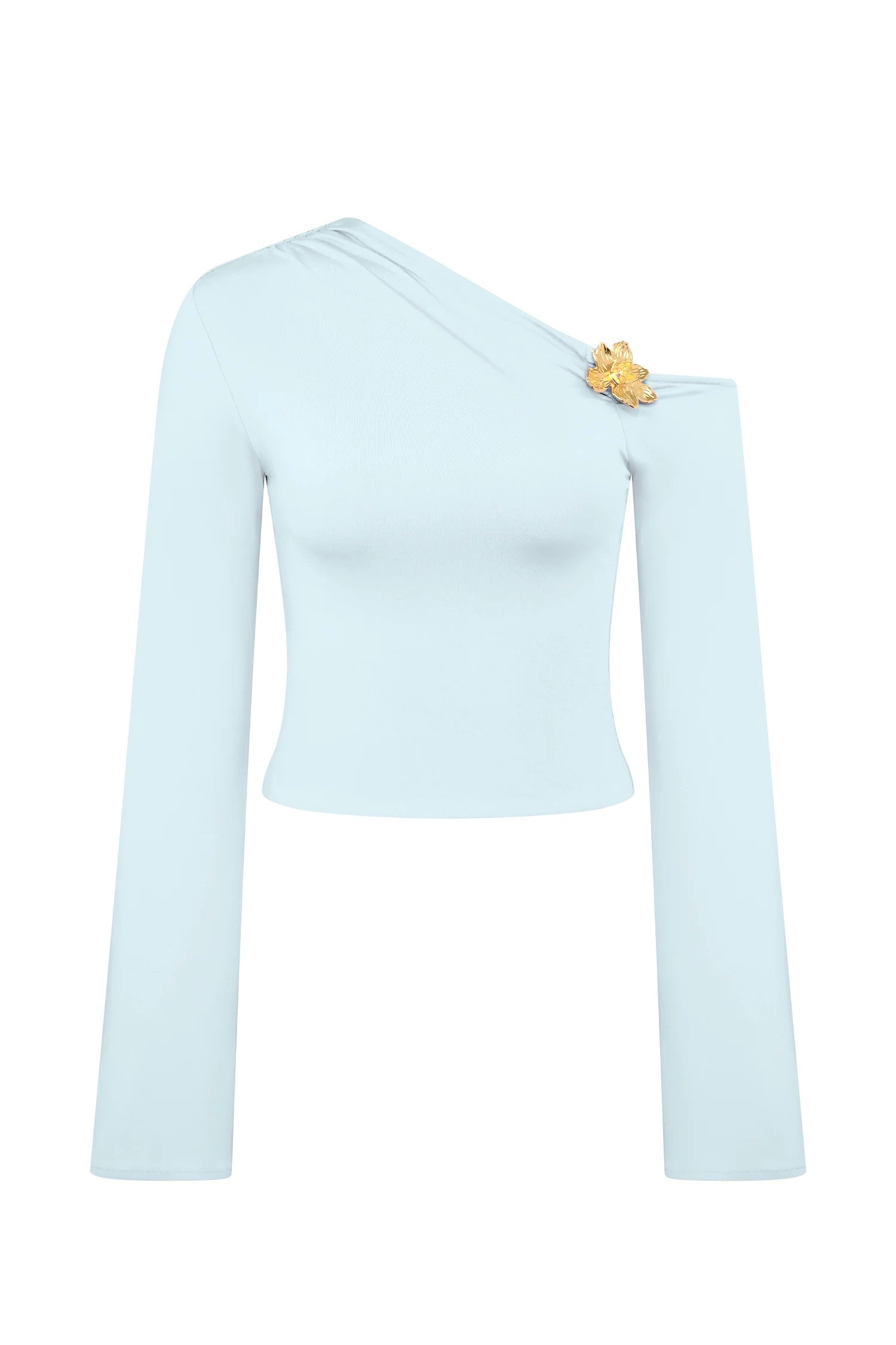 The top is a one - shoulder style, with one shoulder bare, exuding an elegant and sexy charm. The long sleeves are in a flared - sleeve design, adding a vintage touch. The surface of the top has a ruched design, which enhances the three - dimensional effect and accentuates the body curves. The shoulder is adorned with a golden floral ornament, which is gorgeous and eye - catching.