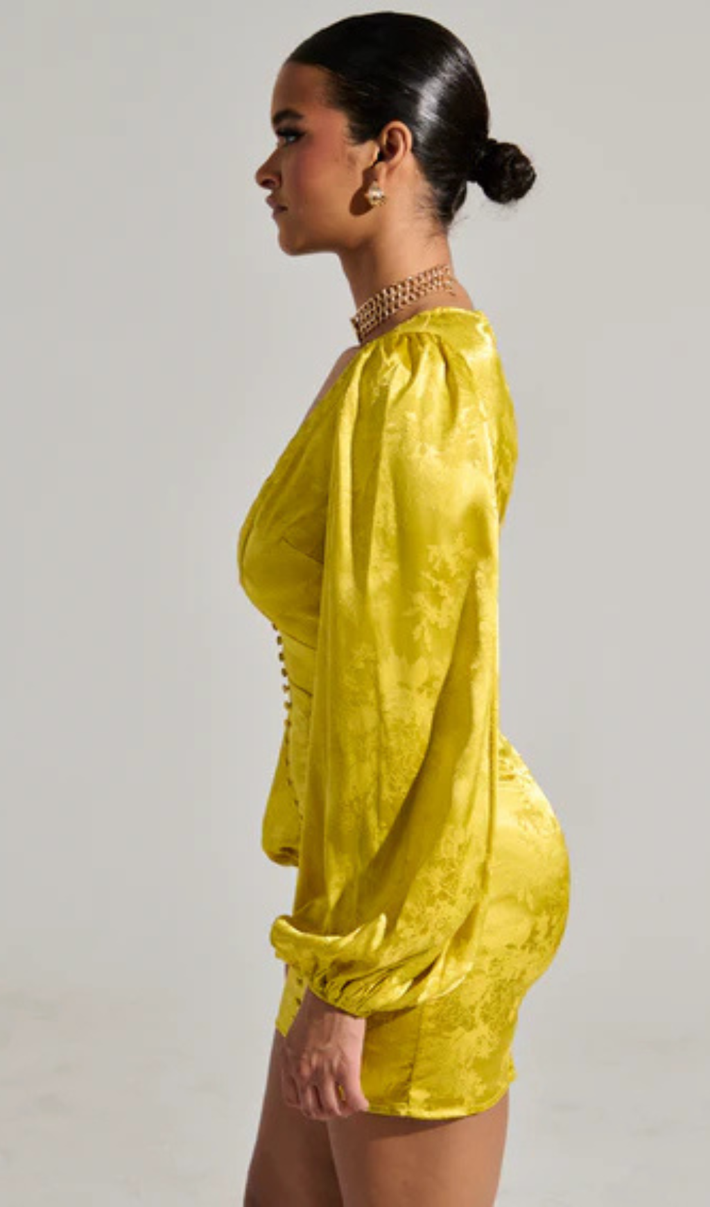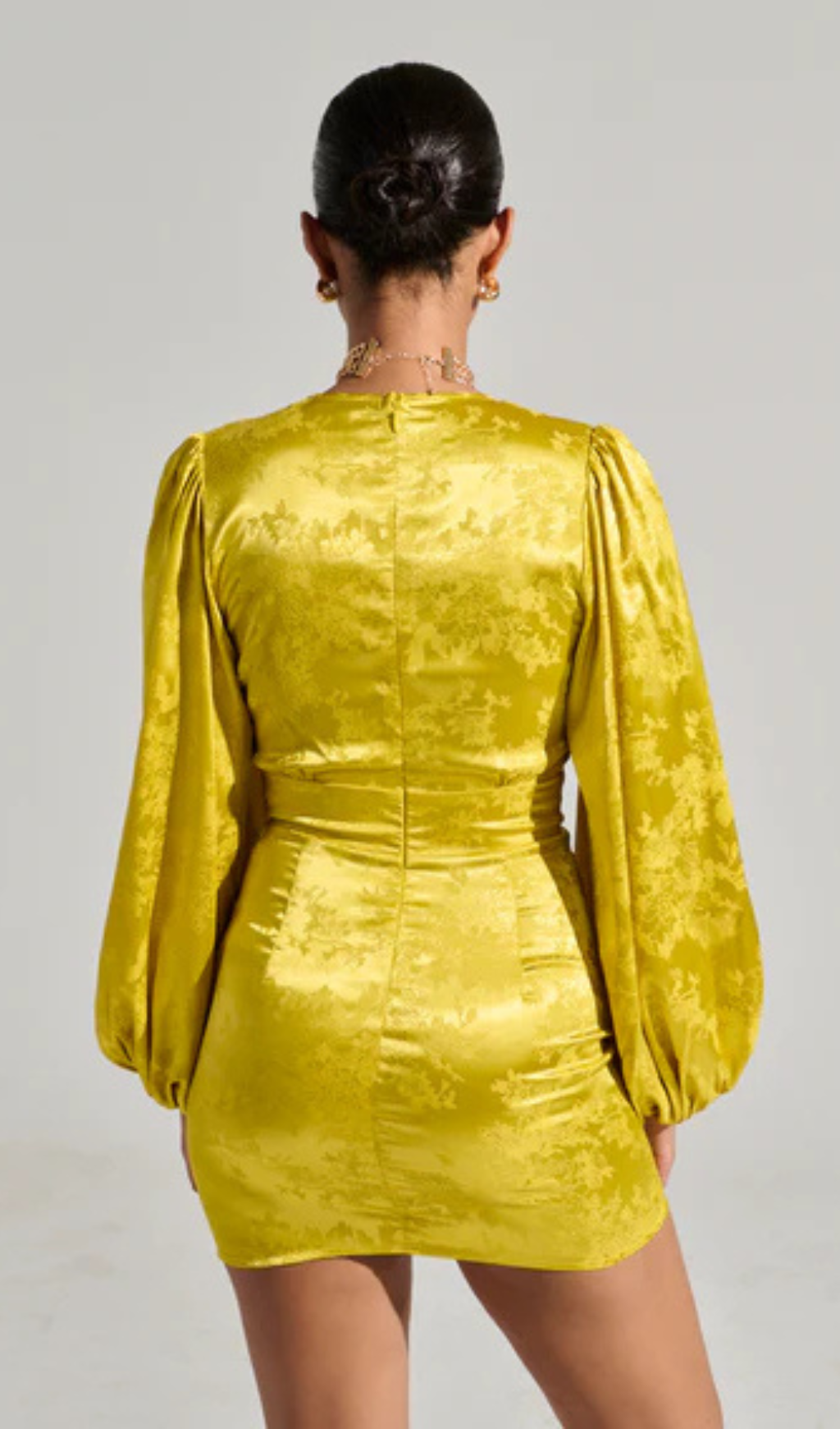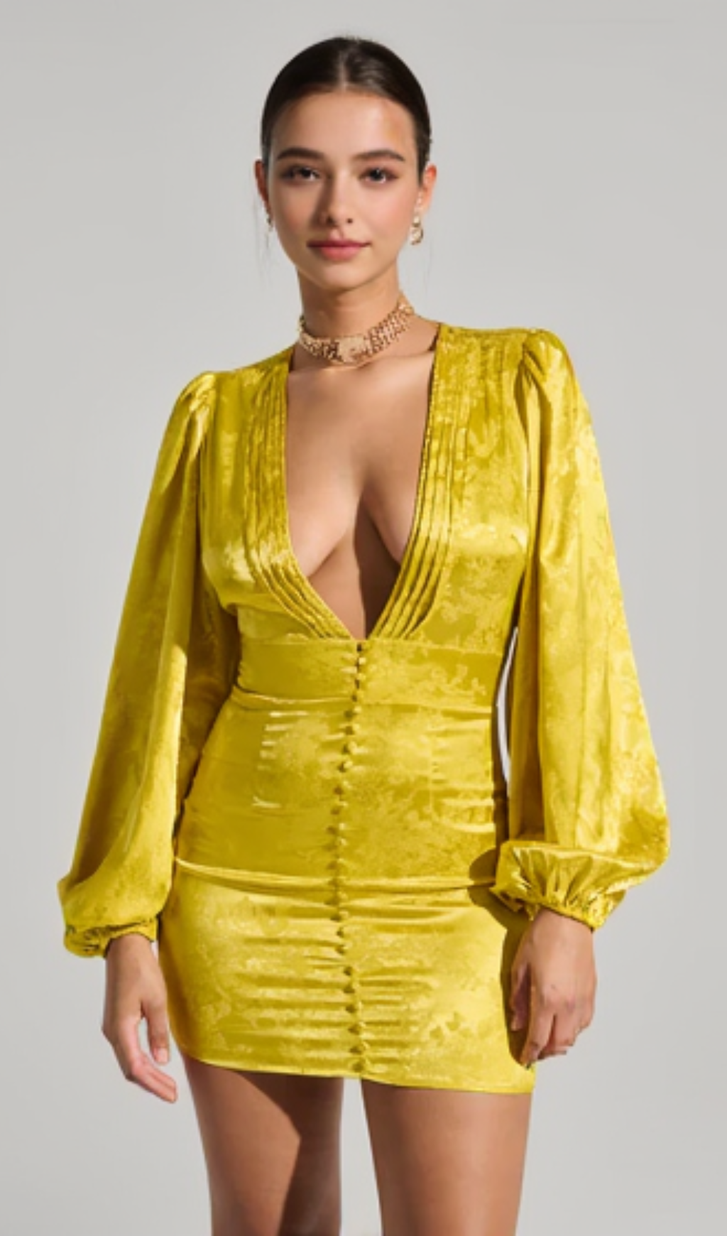 The AKIRA Label Sleek And Chic Satin Mini Dress is a pretty little piece crafted from a lightweight, silky satin fabrication. It features a plunging v-neckline with accordion pleating, long, drapey sleeves with cinched cuffs, a tonal button down front closure and zip back closure, and a jacquard floral pattern throughout. Style it with minimalist pumps and a clutch for an elegant ensemble.