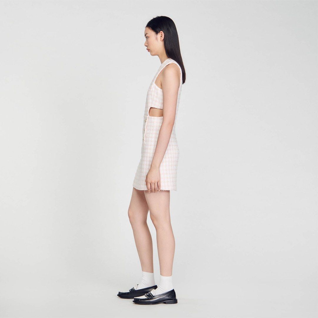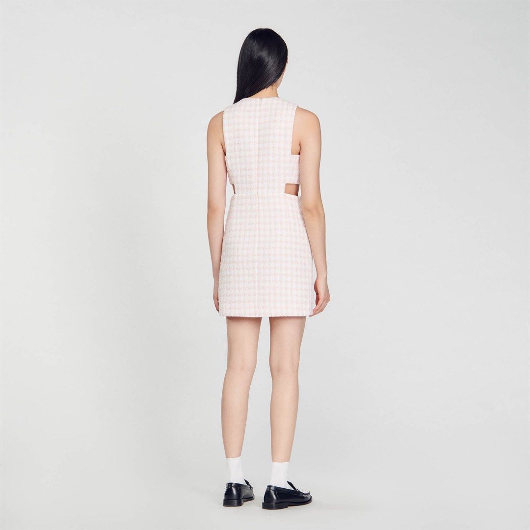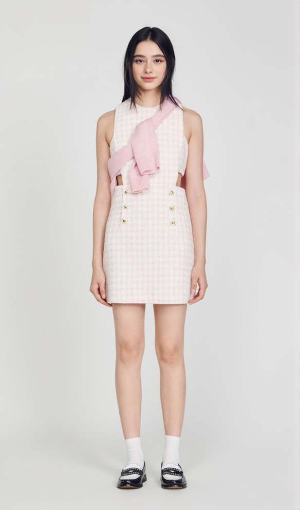 This light pink dress features a playful cutout design that adds a unique touch to a classic pinafore style. Perfect for a day out with friends or a fun night out. (Warning: may cause excessive compliments and envy from others.)