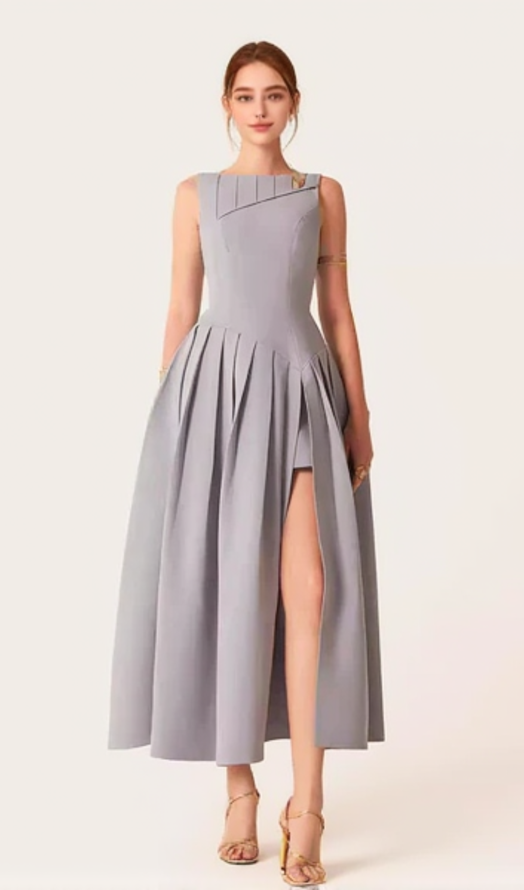 sleeveless pleated slit midi dress in gray