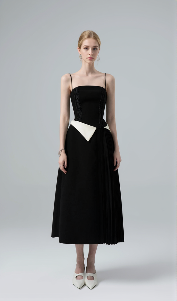 SLIP CONTRAST COLOR MIDI DRESS IN BLACK