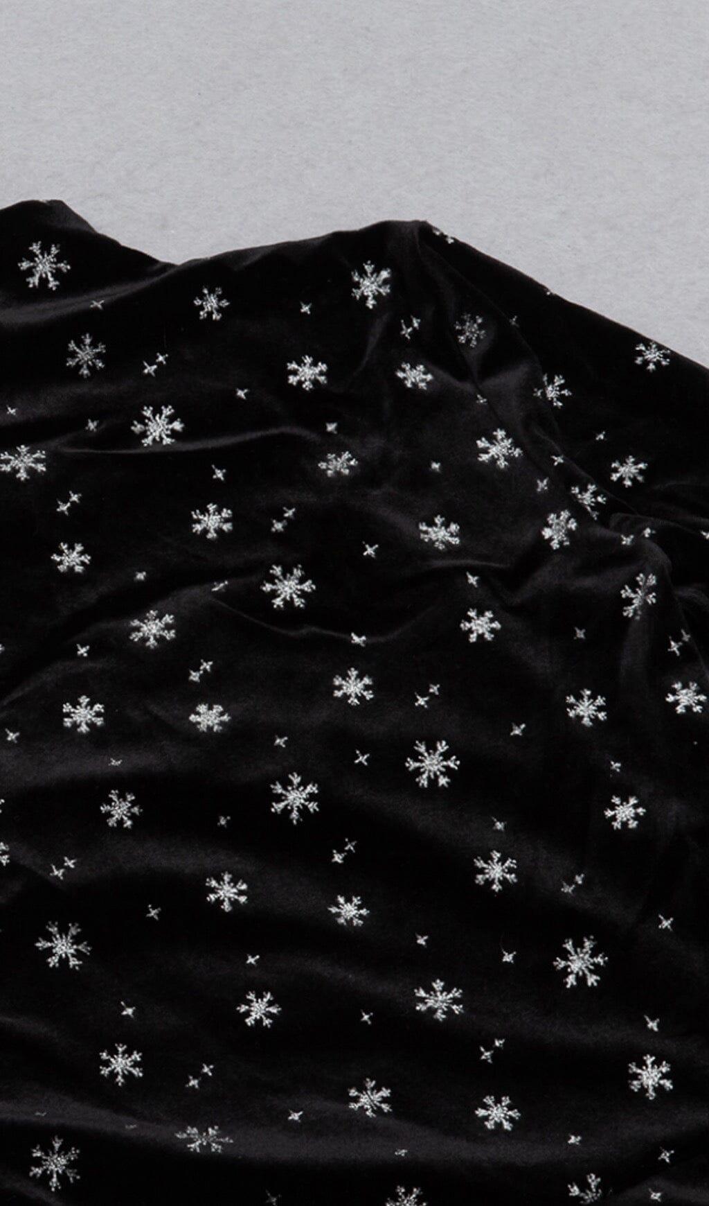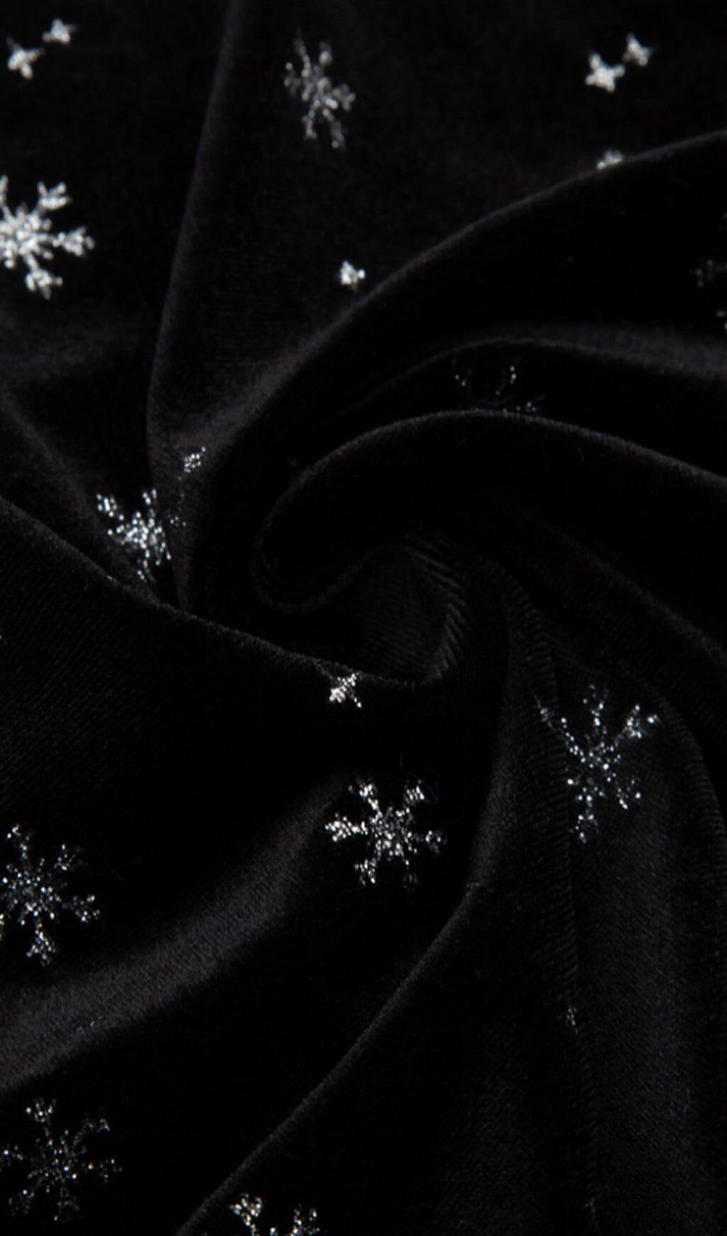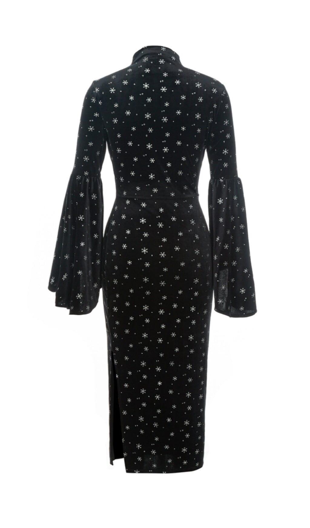 Embrace the beauty of snowflakes with our Snowflake Long Sleeve Midi Dress in Black. This dress is designed for those who love the enchanting allure of winter but crave warmth and comfort. Made with a soft velvet material, it exudes a retro charm while keeping you cozy. The wide flared sleeves add a touch of elegance, and the opening design on the chest adds a hint of allure.