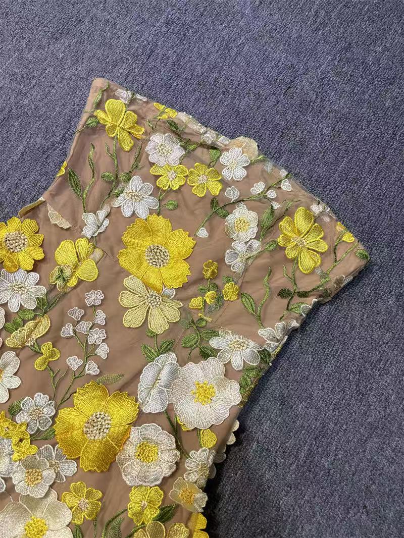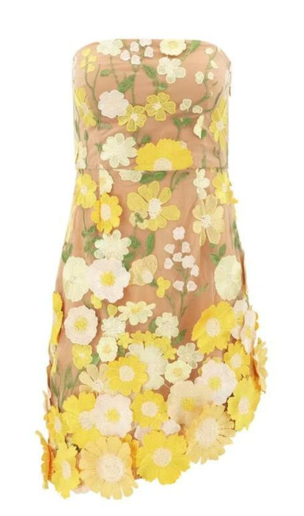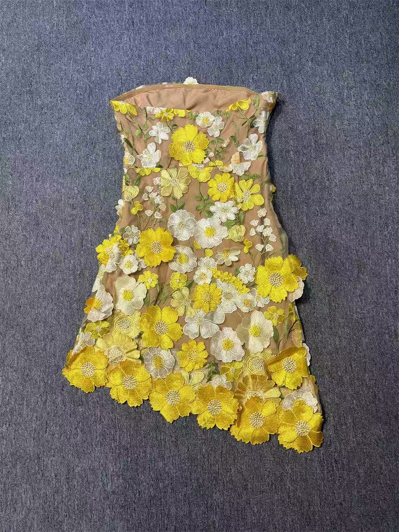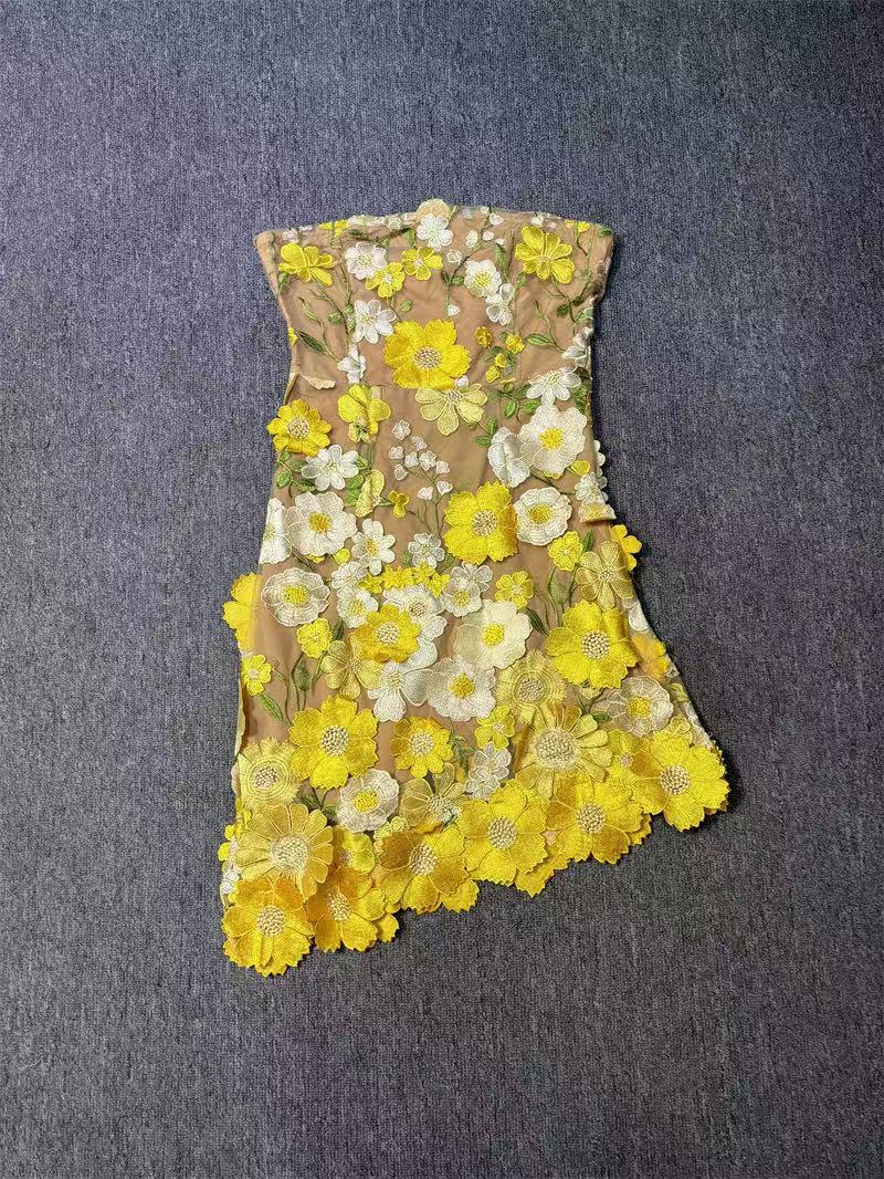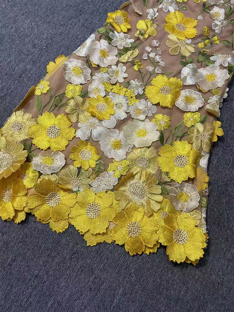 Adorned with three - dimensional floral embellishments, the dress features a vibrant color palette dominated by yellow, accented with white flowers. These bright and lively hues exude the essence of spring. The floral motifs add depth and a three - dimensional quality, enhancing the dress's visual appeal.