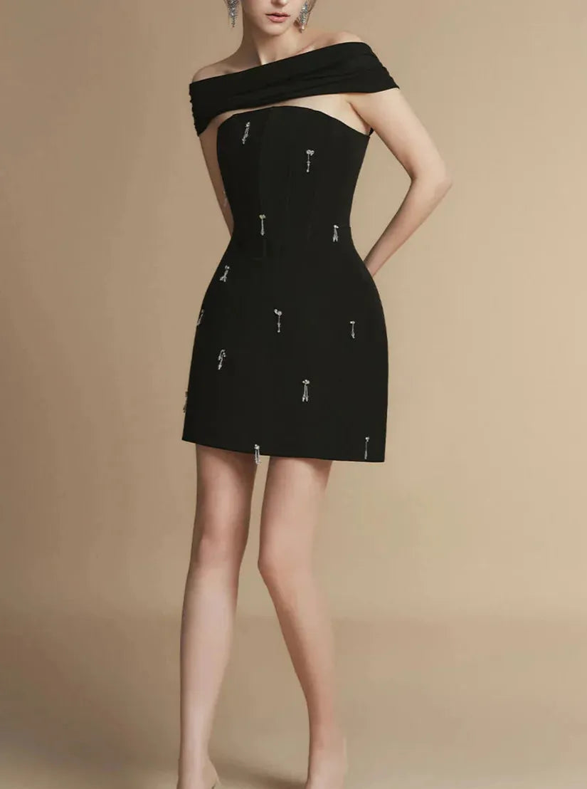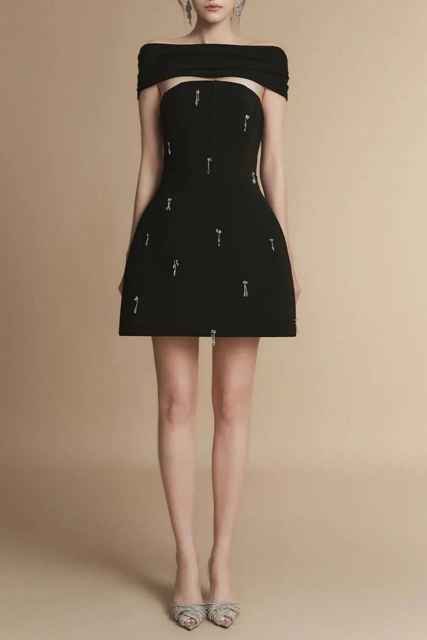 • Flexible scarf neckline, Attached rhinestones on the bodice