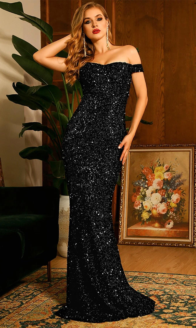 Show up at your next formal event in this shimmering sequin gown. The Sparkle All Night maxi dress features slender off the shoulder straps, a sweetheart neckline, and a mermaid-inspired silhouette with a flared hem. Add strappy heels and statement earrings to complete the look.
