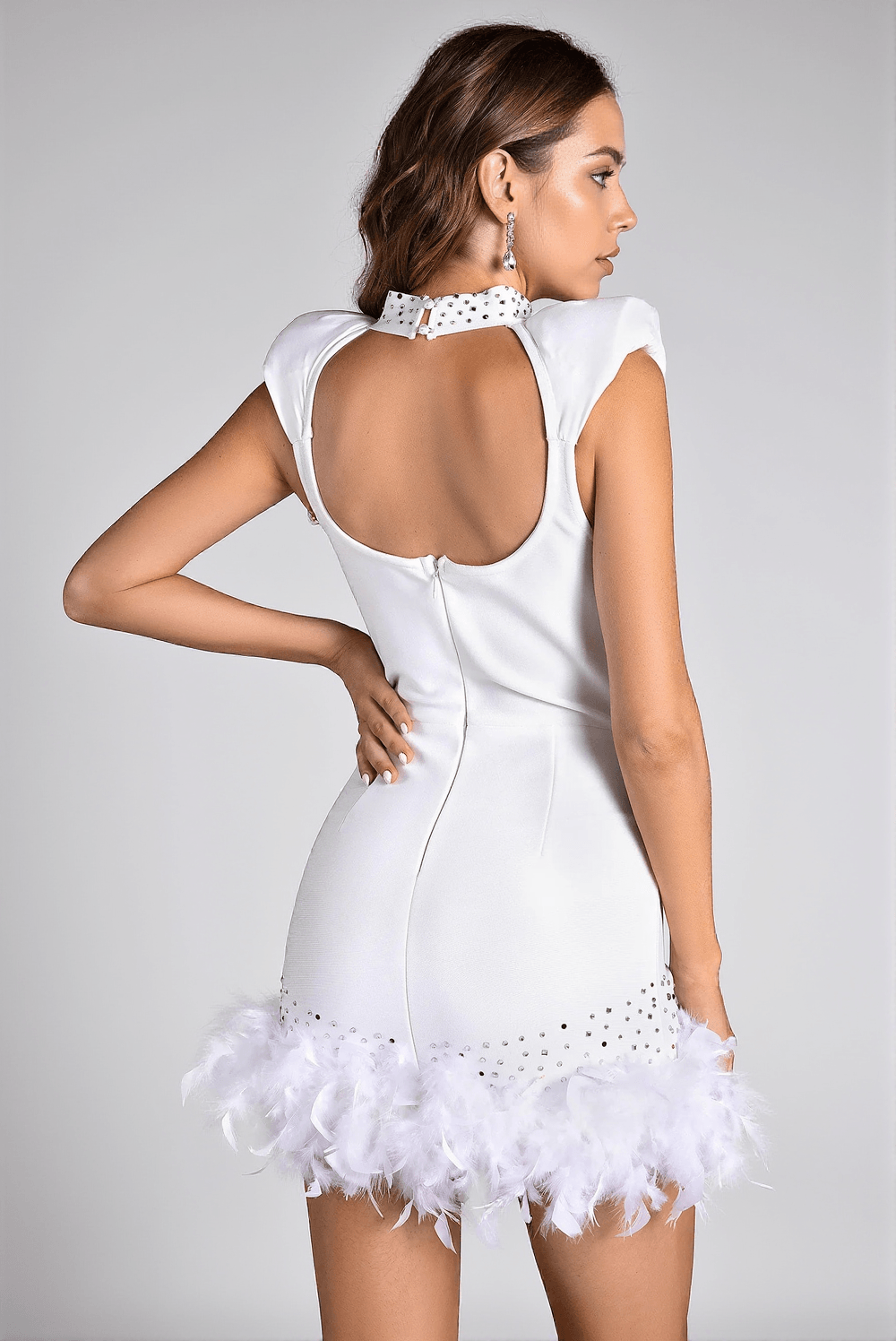 Elevate your fashion game with the breathtaking Spiteridi Rhinestone Feather Mini Dress. Designed to captivate, this dress combines elegant sophistication with whimsical charm through its intricate rhinestone embellishments and playful feather hemline.