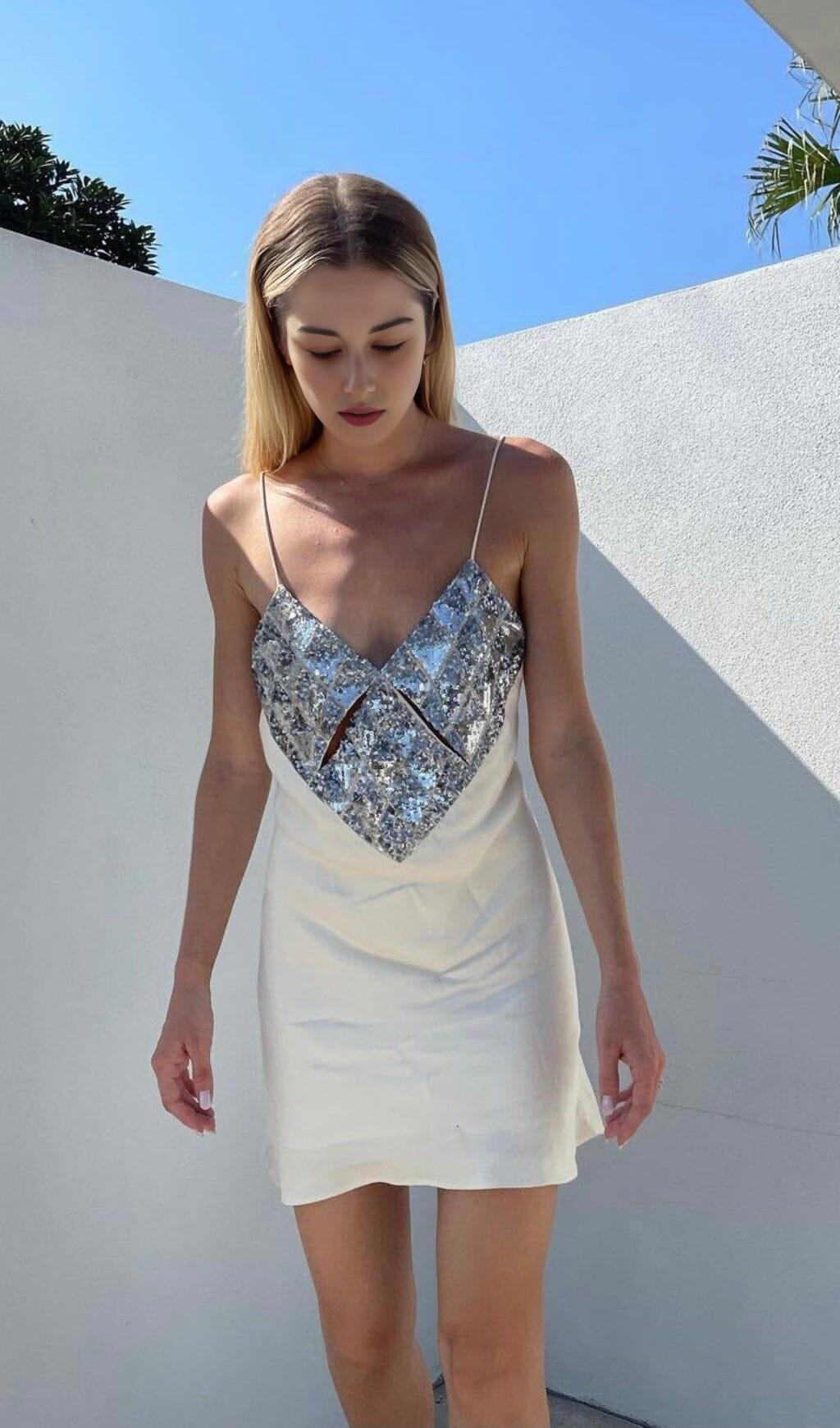 SPLICED SEQUIN BACKLESS DRESS IN WHITE