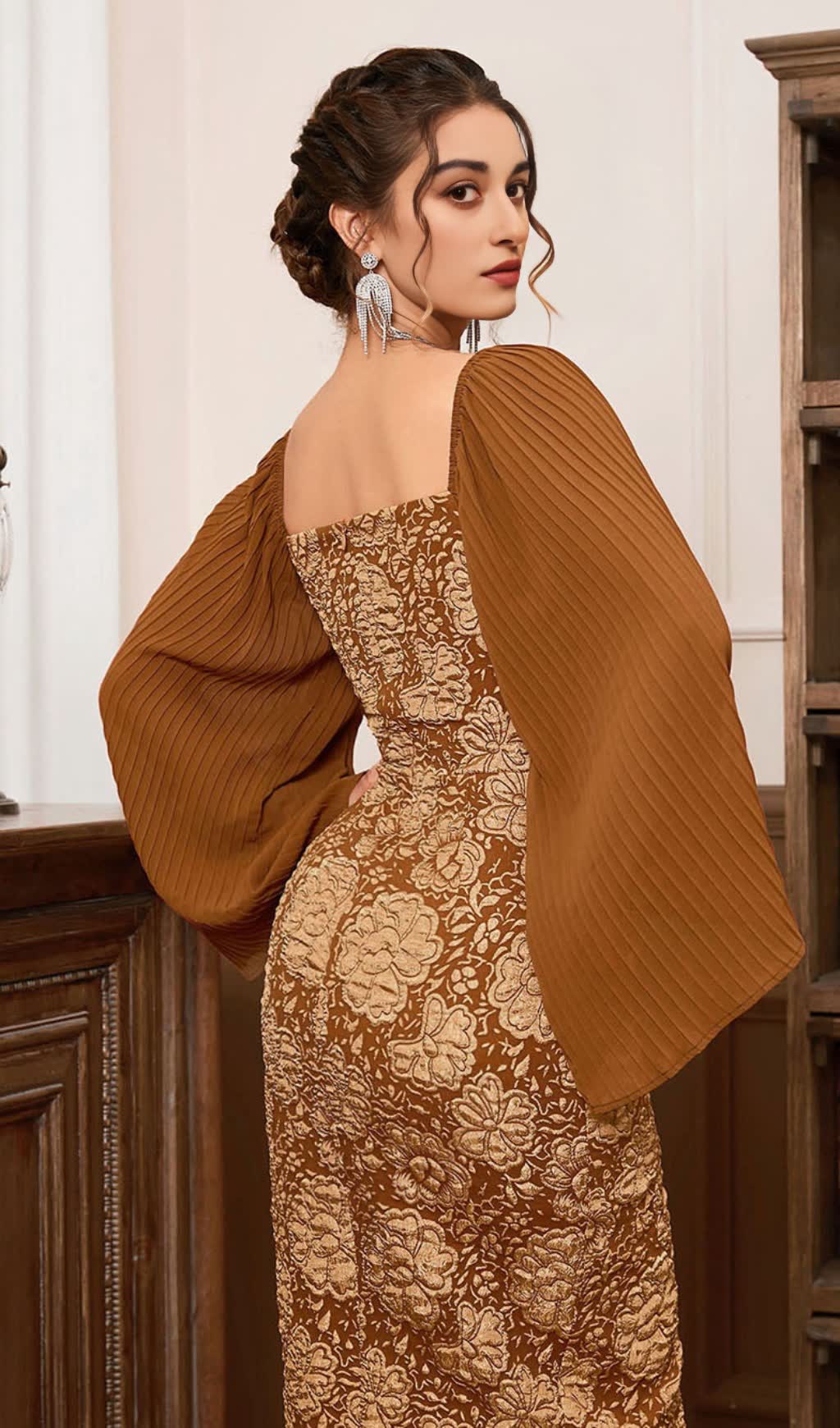 BROWN SQUARE COLLAR JACQUARD BAG BUTTOCK SLIT DRESS