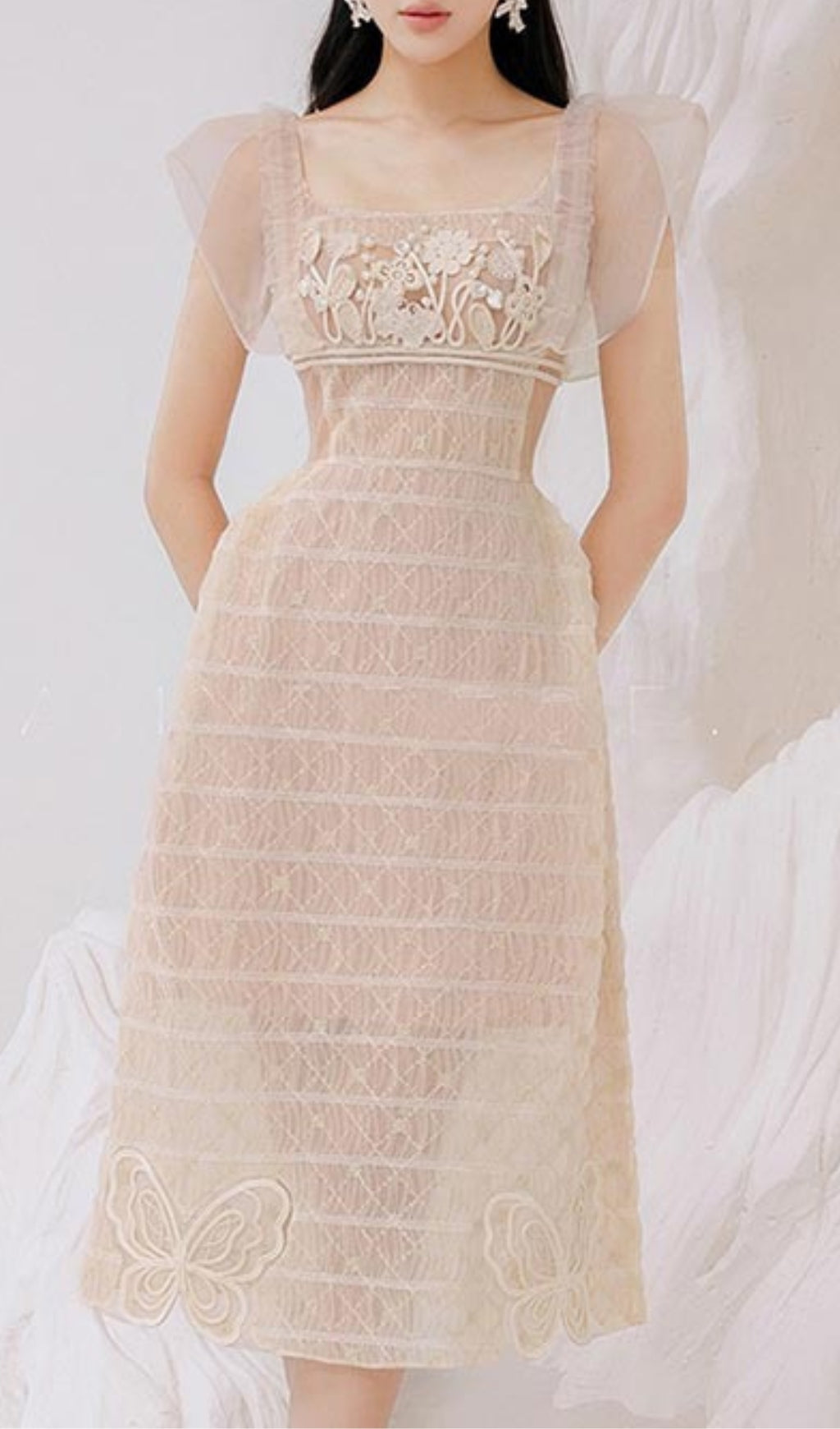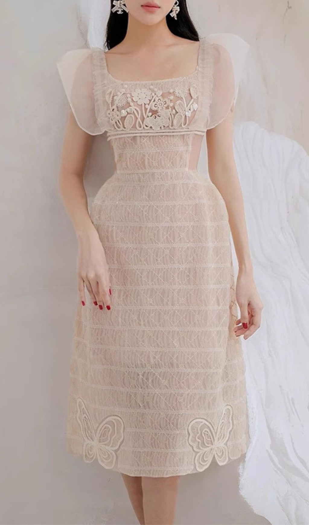 This elegant and sophisticated dress features a square neckline and delicate lace details, providing a timeless and classic look. Perfect for any occasion, this dress will effortlessly enhance your natural beauty.