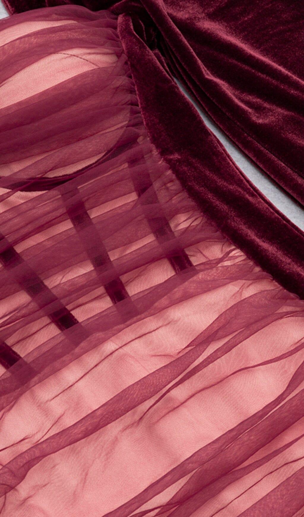 • The dress features delicate stitching of thin and sweet mesh fabric, breaking the monotony of the velvet and adding a touch of femininity.
