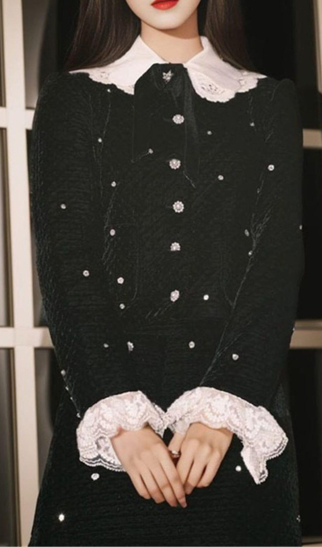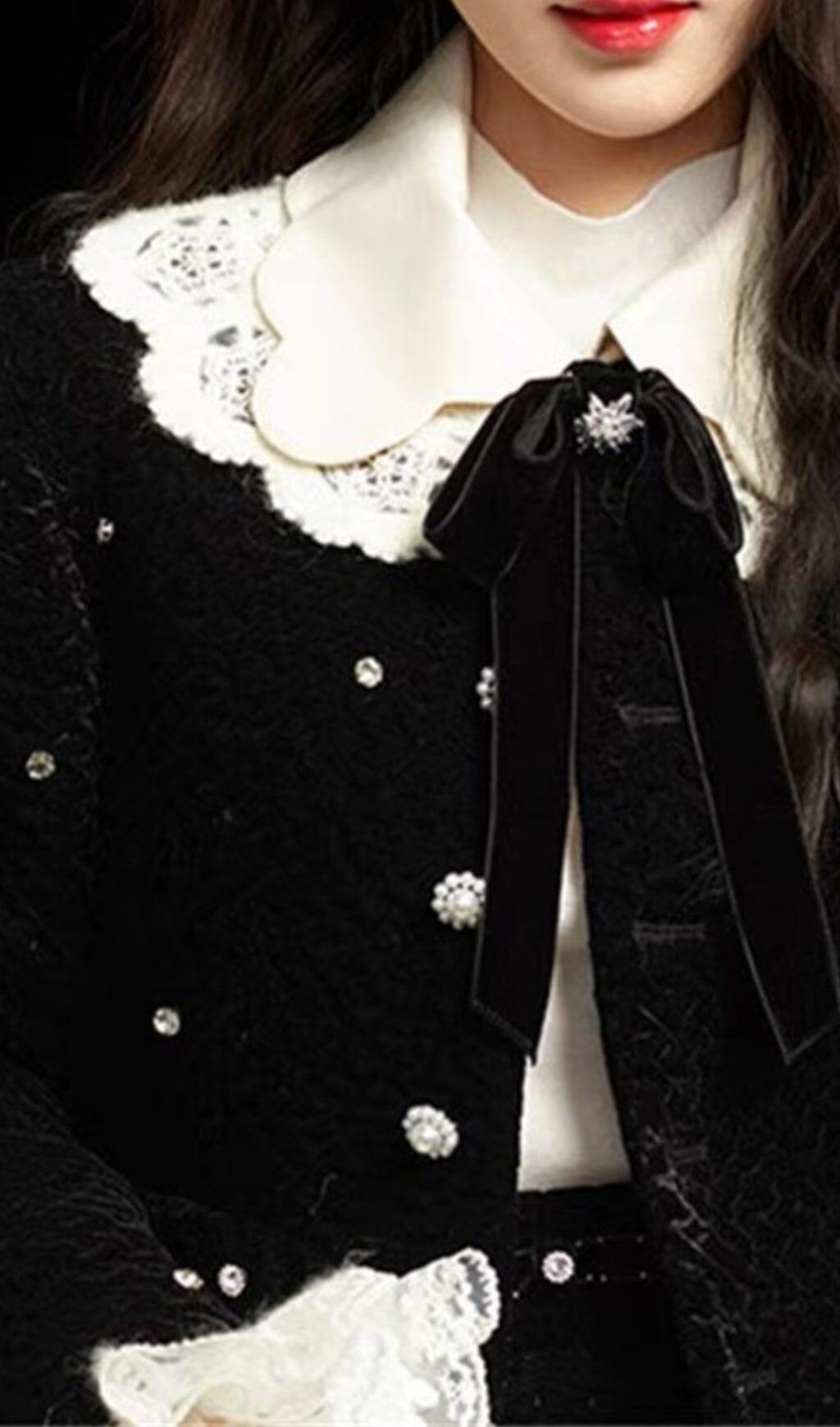STARRY VELVET RHINESTONE LACE TRUMPET SLEEVE SHORT COAT & SKIRT SUIT