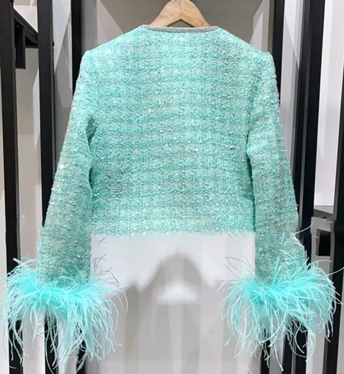 STEPHANIE BOUCLE FEATHER JACKET SUIT IN GREEN