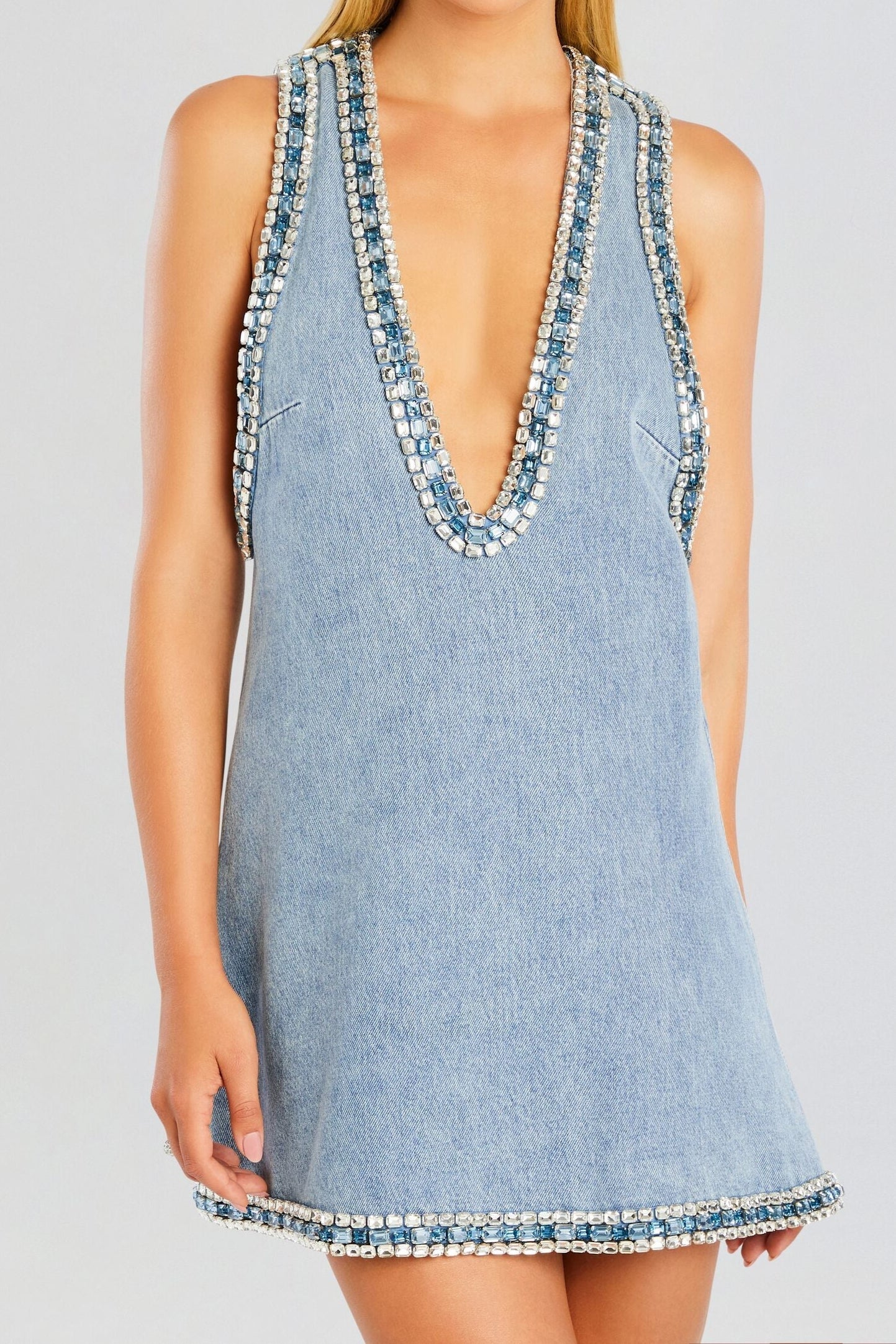 Stevie crystal Embellished Denim mini Dress in pale blue