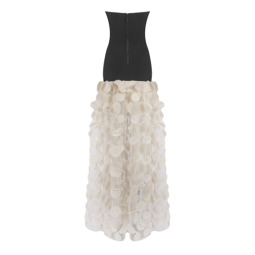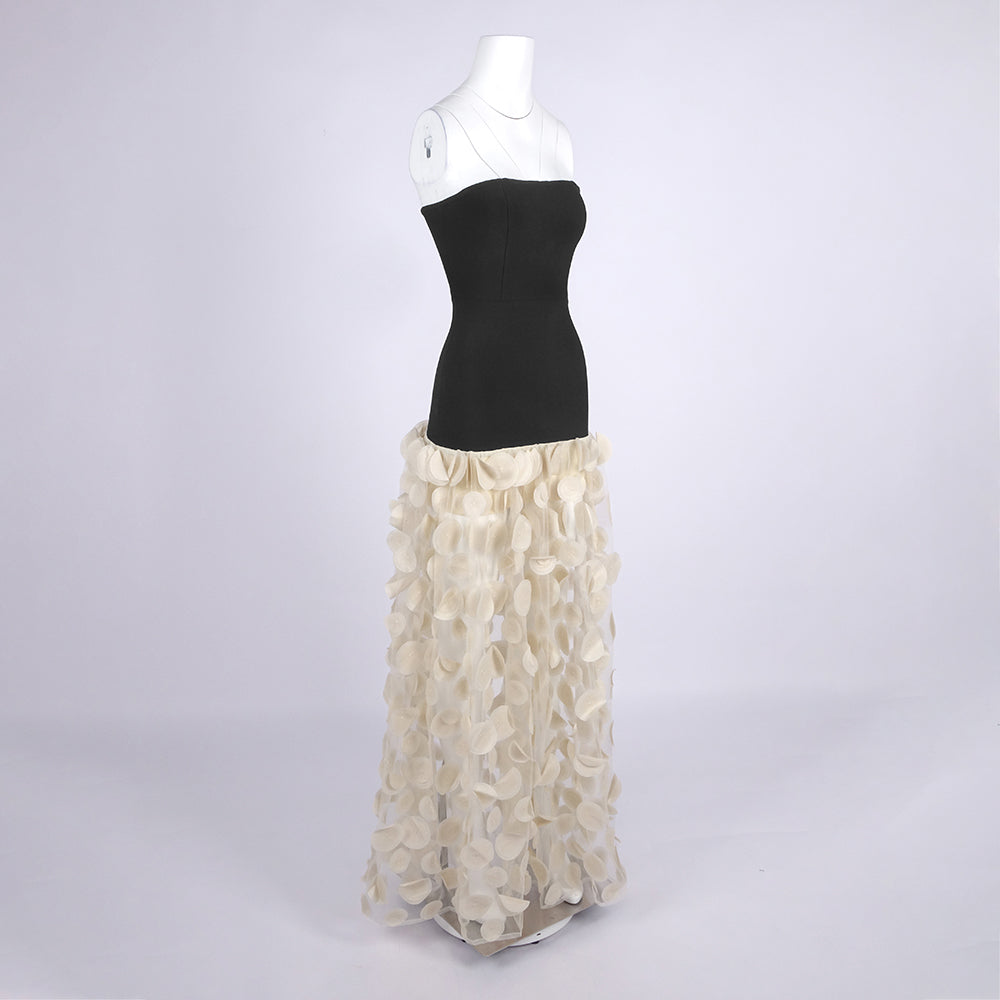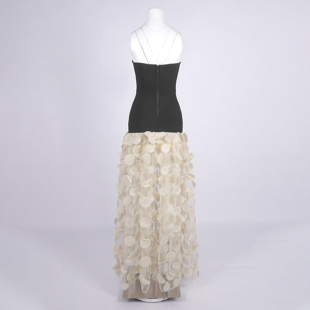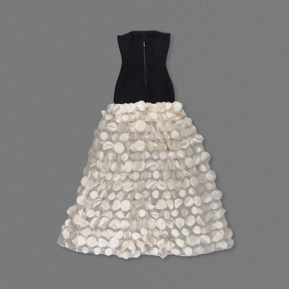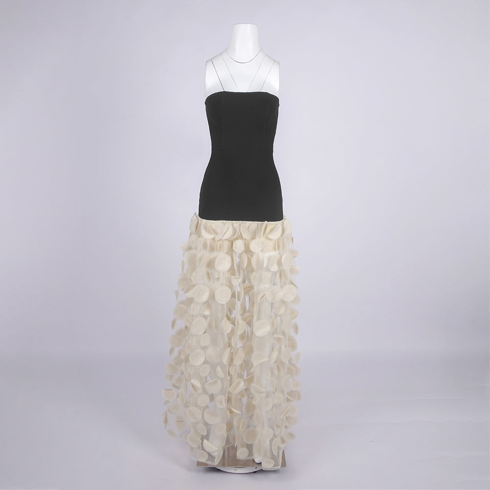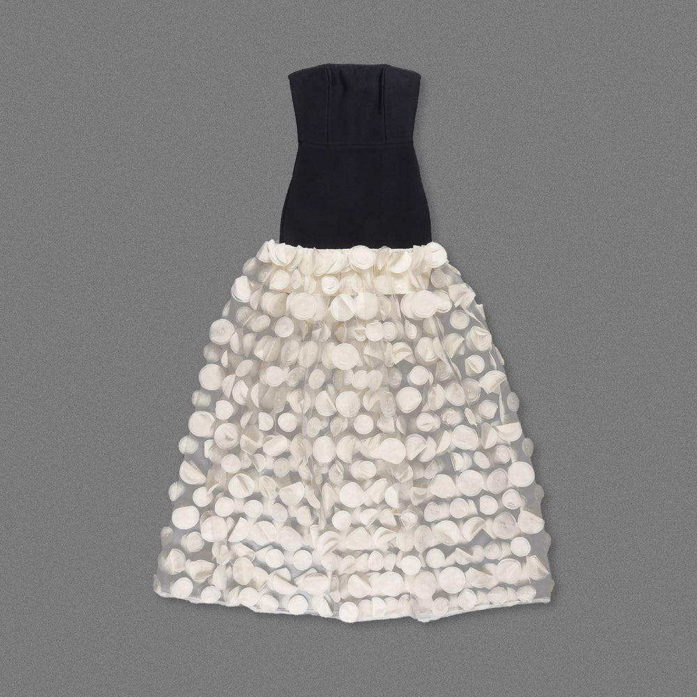 • Decoration: The lower part of the skirt is densely decorated with numerous black circular embellishments, resembling three - dimensional petals or patches. These are arranged in an orderly yet random manner on a semi - transparent material, adding visual hierarchy and a sense of fun, creating a luxurious and avant - garde style. This style of dress is suitable for occasions such as fashion shows, art exhibition openings, and high - end parties, where one needs to display unique taste and a fashion - forward attitude.