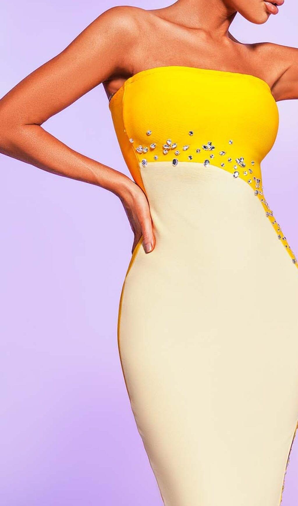 STRAPLESS BANDAGE MIDI DRESS IN YELLOW