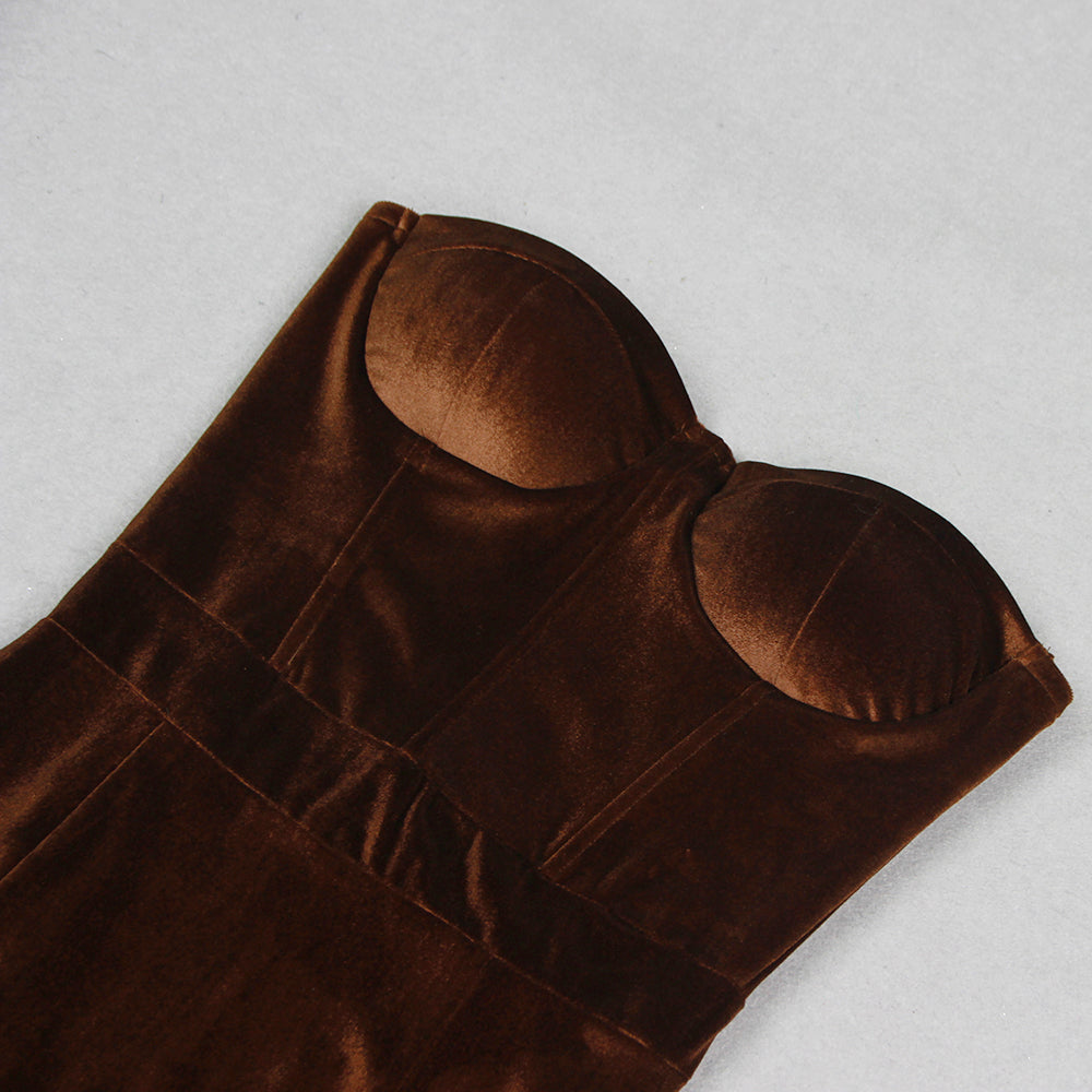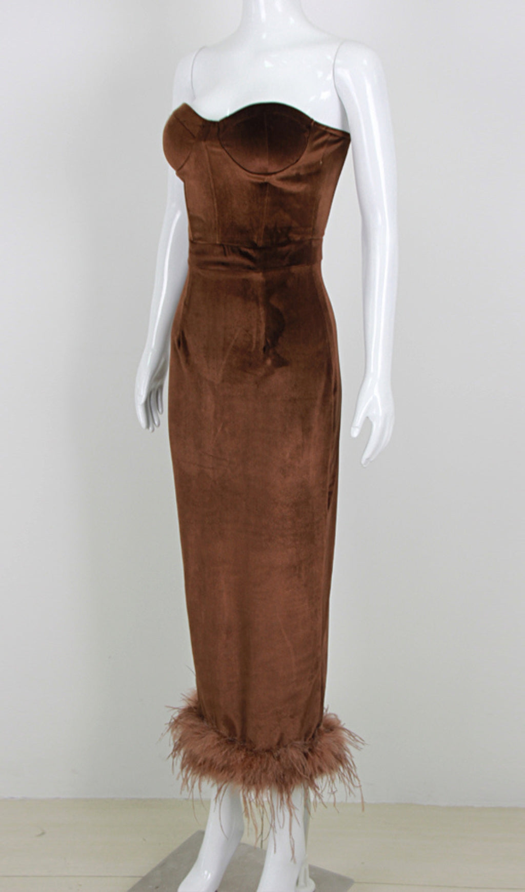 The strapless bustier adds a touch of sophistication while the feather hem and velvet material bring a bold and luxurious feel. Perfect for special occasions and making a statement.