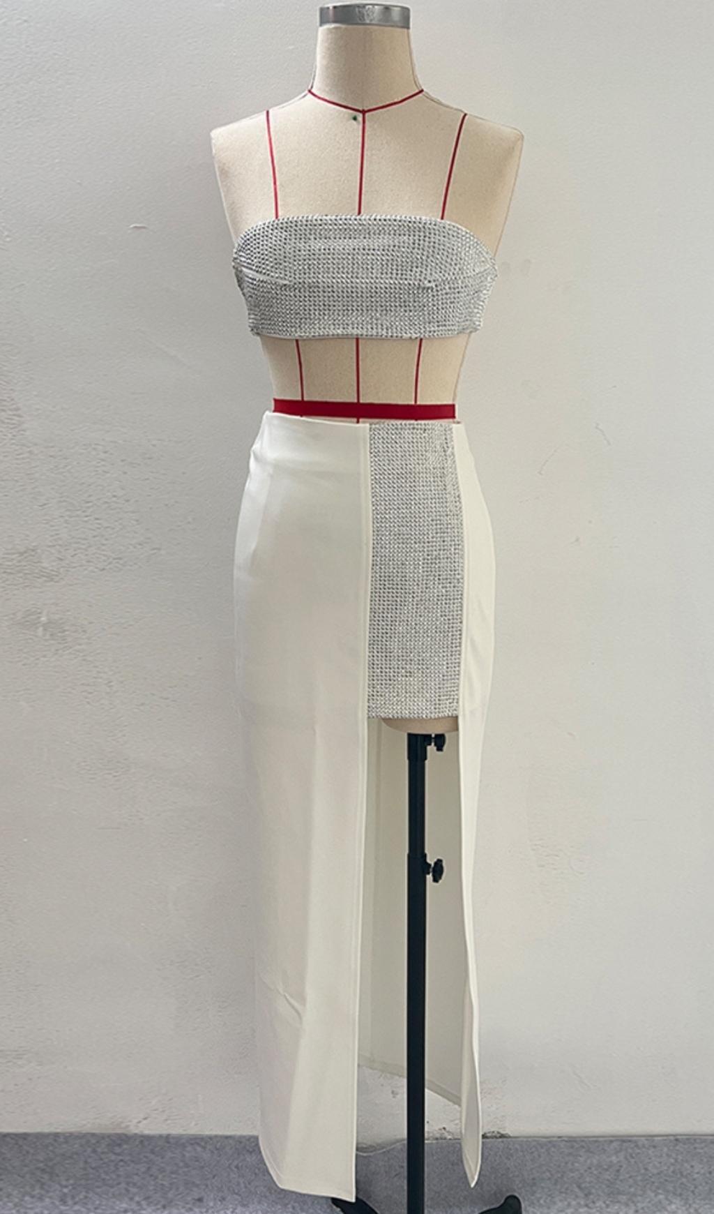 Elevate your style and make a statement with our Strapless Crystal Two Piece Set. Order now and be the center of attention wherever you go!