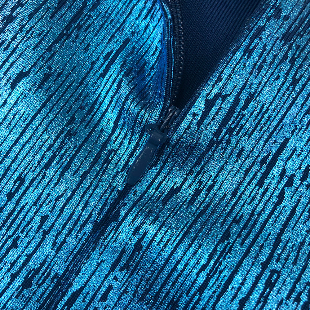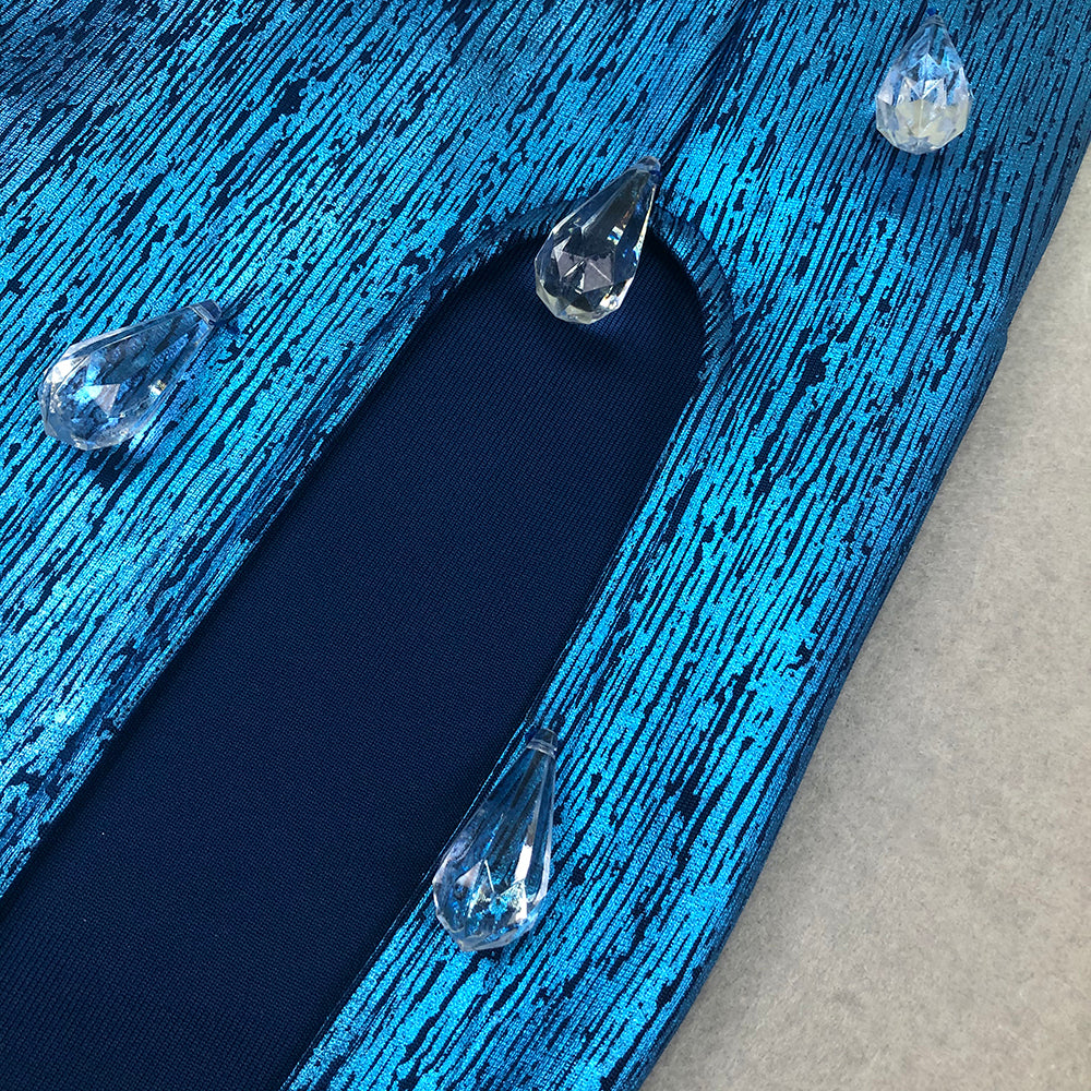The vibrant blue color and striking foil print will make you stand out at any event. The strapless design adds a touch of elegance, while the crystal detailing adds a touch of sparkle. Perfect for a glamorous night out.