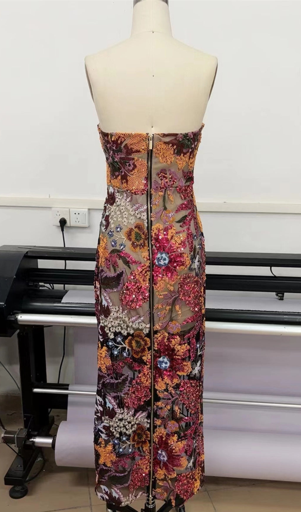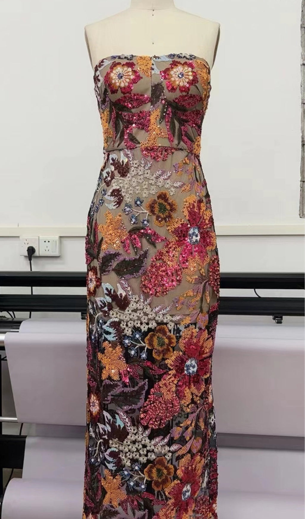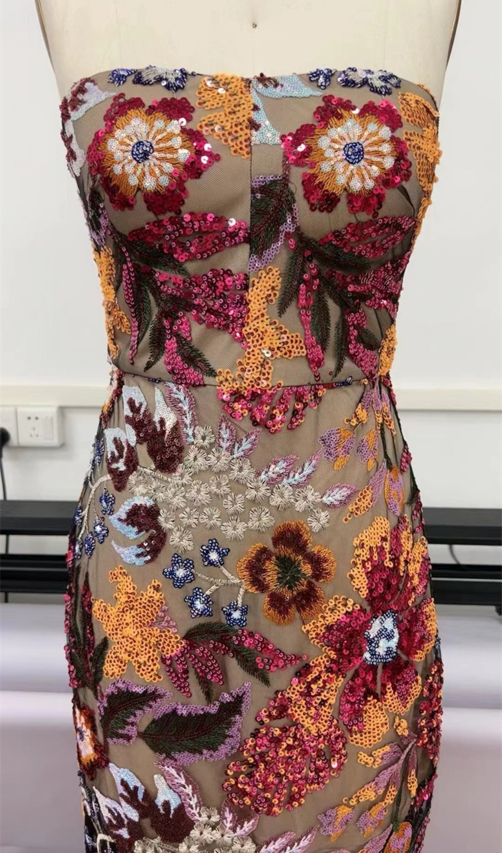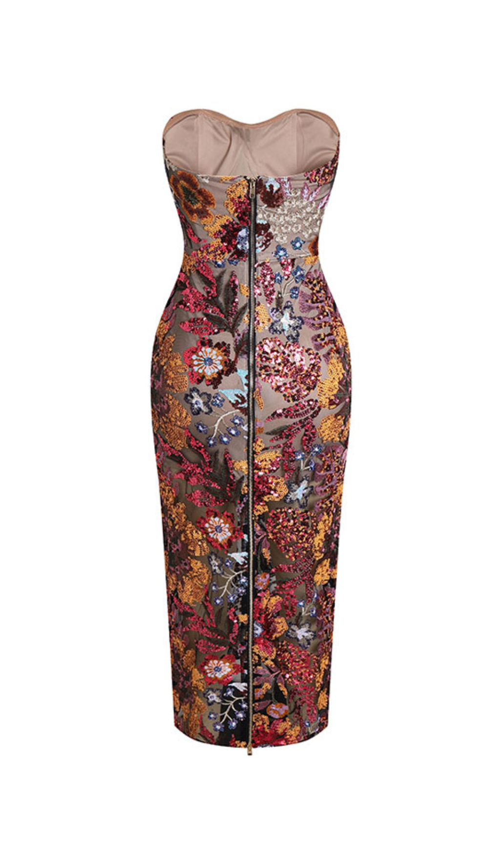 This strapless floral sequin dress is sure to make heads turn! Its maxi length makes it comfortable and chic, so your look is guaranteed to stay on fleek all night long!