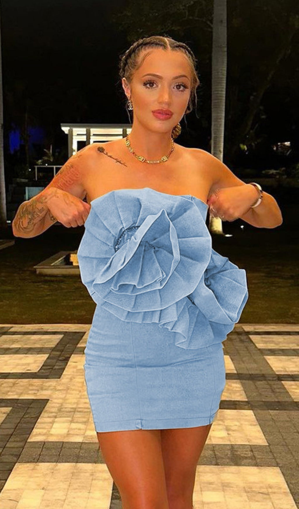 ARISTA STRAPLESS FLOWER DENIM DRESS