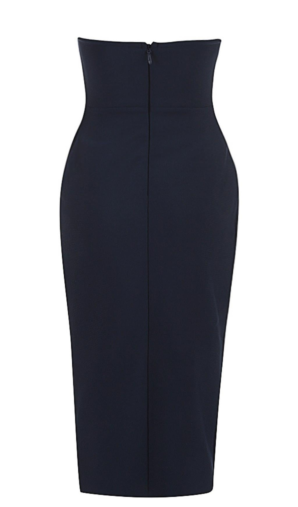 Elevate your style with our Strapless Midi Dress in Blue. Order now and be the center of attention wherever you go!
