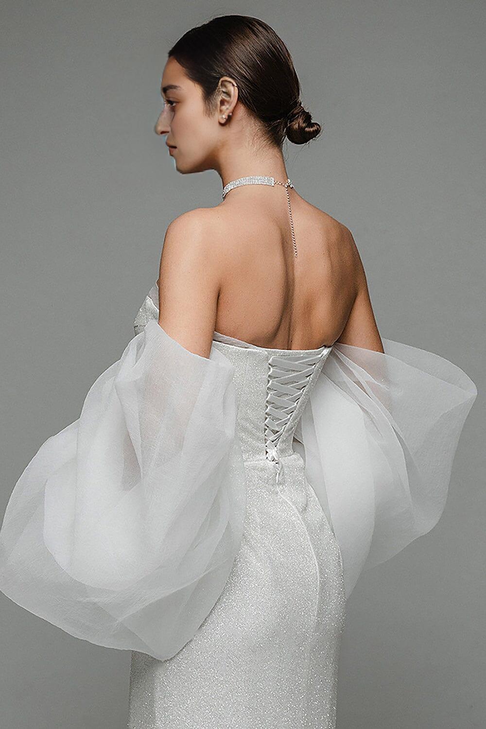Why Choose Our Strapless Puff Sleeves Shiny Glitter Wedding Dress?