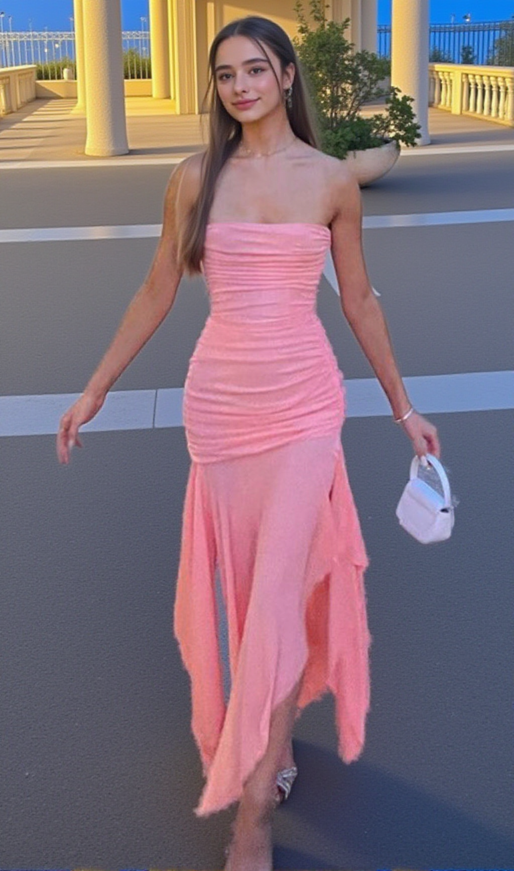 This stunning strapless dress features a flattering ruched fishtail silhouette and thigh-high slit. Perfect for a special occasion, look your best with this stylish and feminine dress.