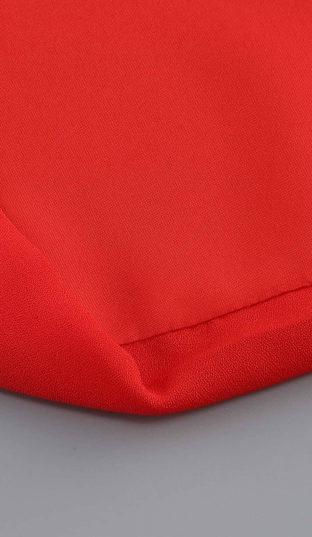 STRAPLESS RUFFLE SLIT MIDI DRESS IN RED