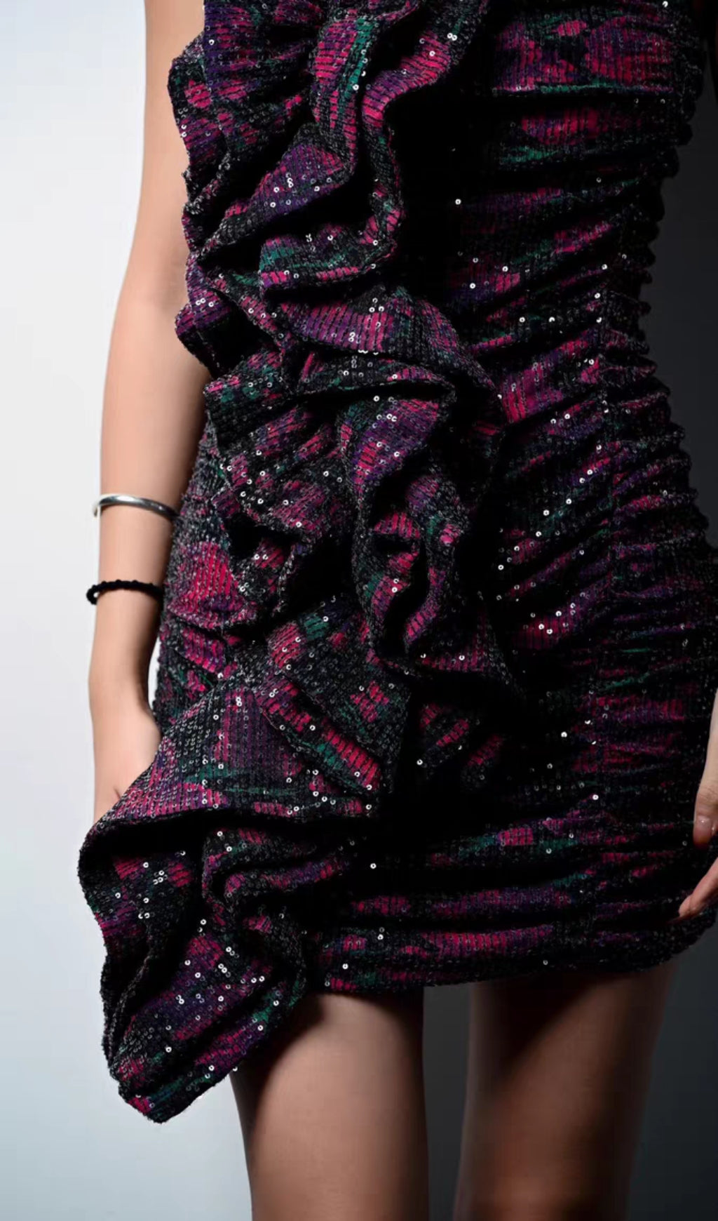 STRAPLESS RUFFLED SEQUIN MINI DRESS