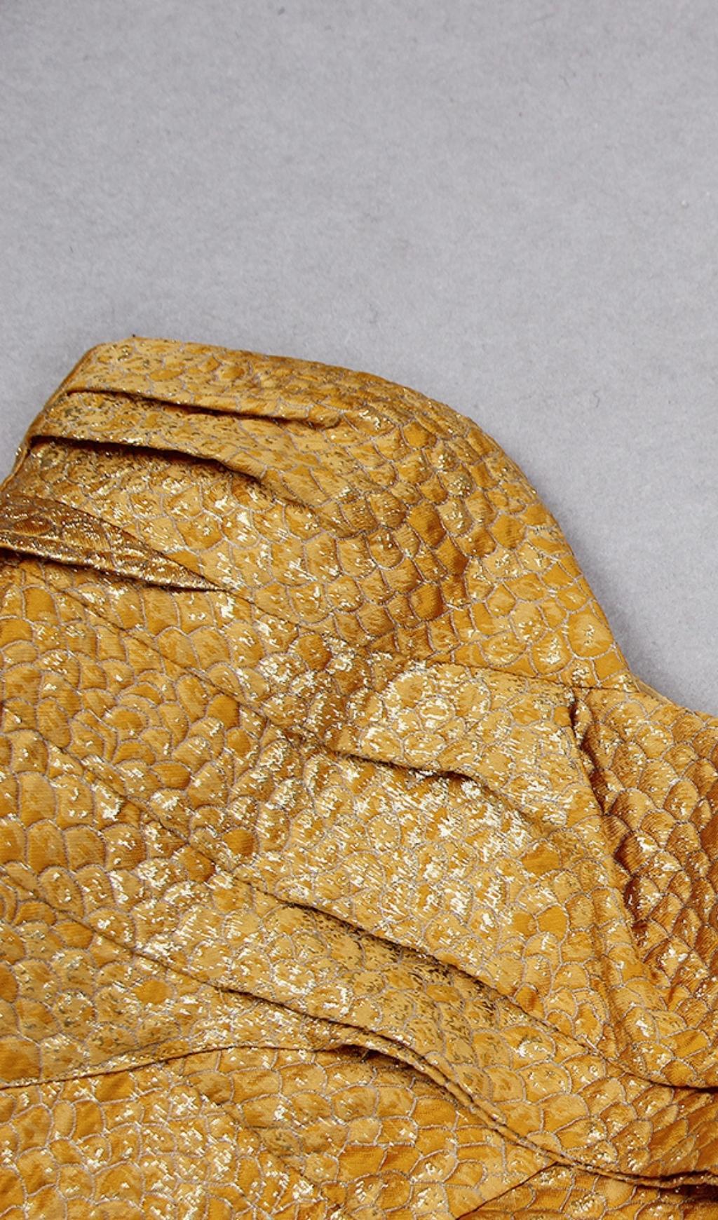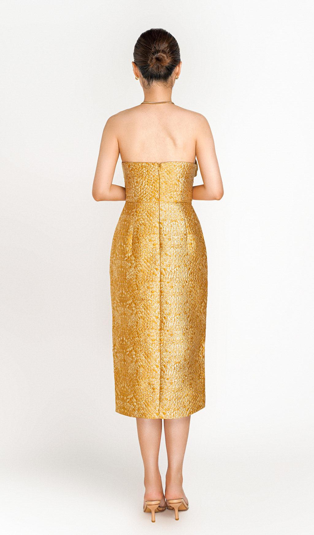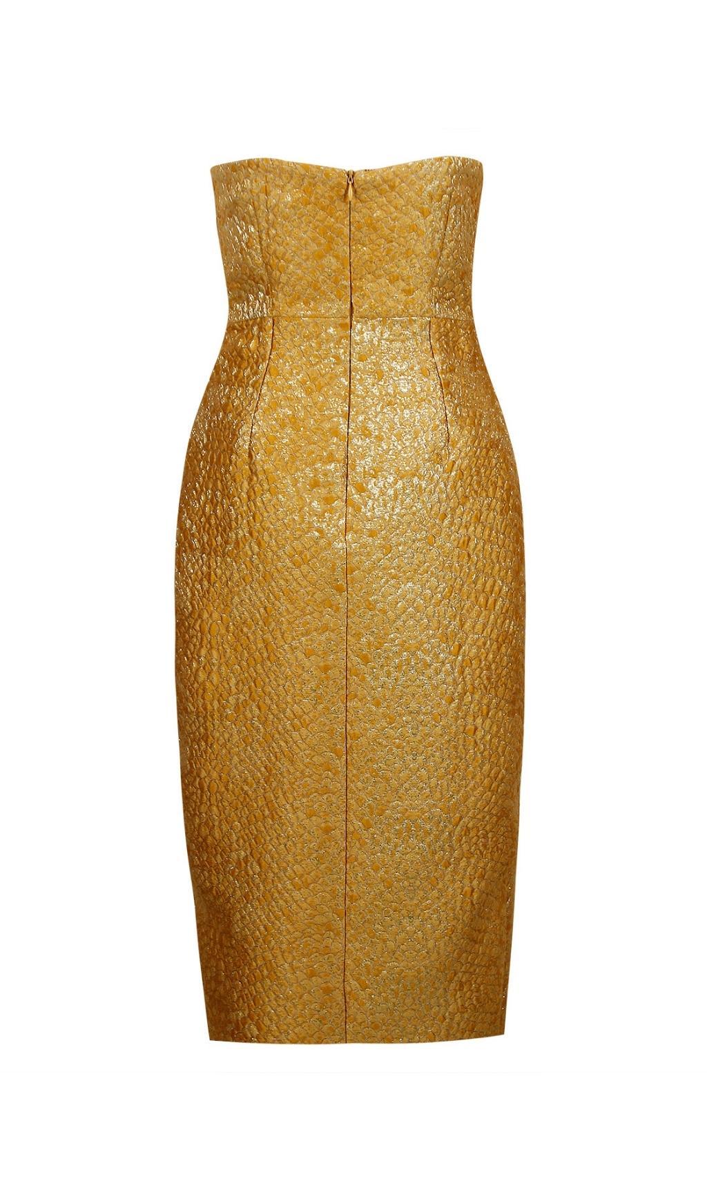 STRAPLESS SPLIT MIDI DRESS IN GOLD