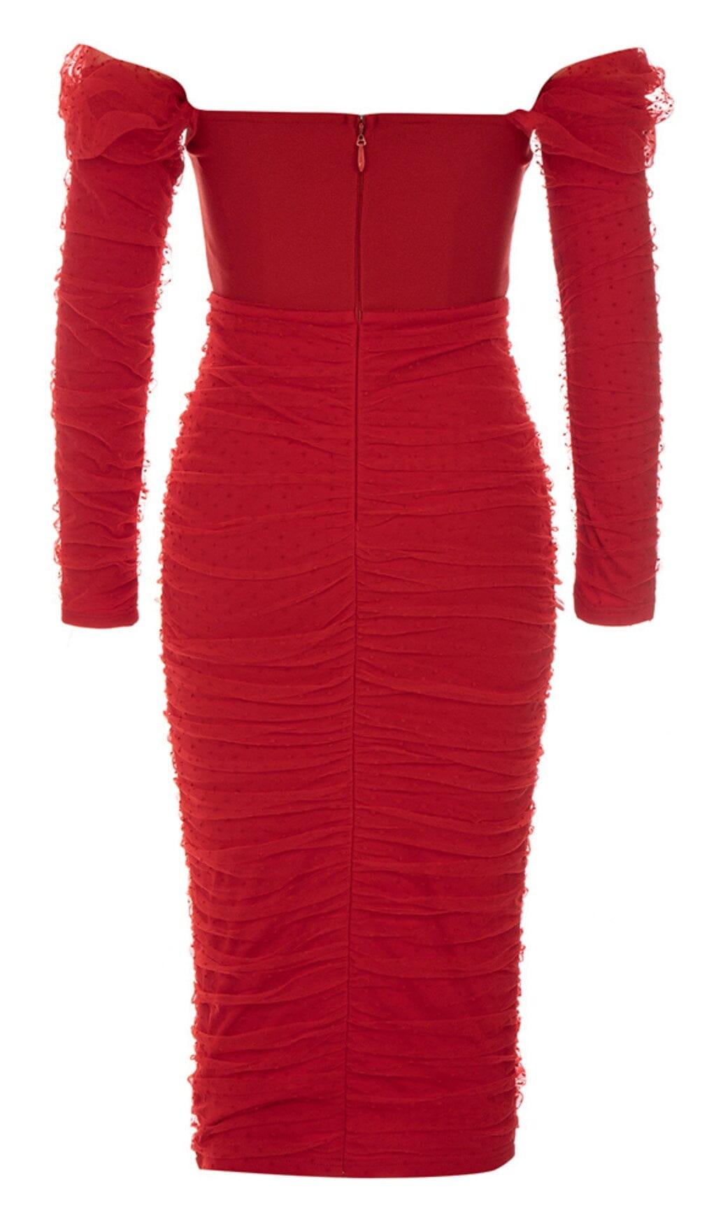STRAPLESS STRAPLESS LACE MIDI DRESS IN RED