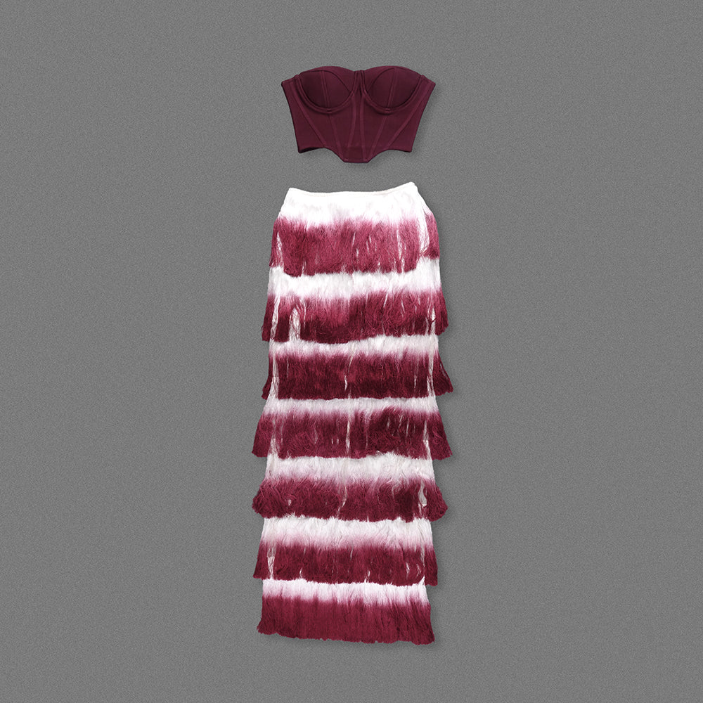 • Skirt: It is a long - length skirt composed of alternating burgundy and white fringed stripes. The colors transition naturally, creating a gradient effect. The multiple layers of fringes add a dynamic and lively feel to the garment, swaying gracefully when one moves, which is highly visually appealing. This overall outfit is suitable for occasions that pursue individuality and trend, such as music festivals and fashion parties.