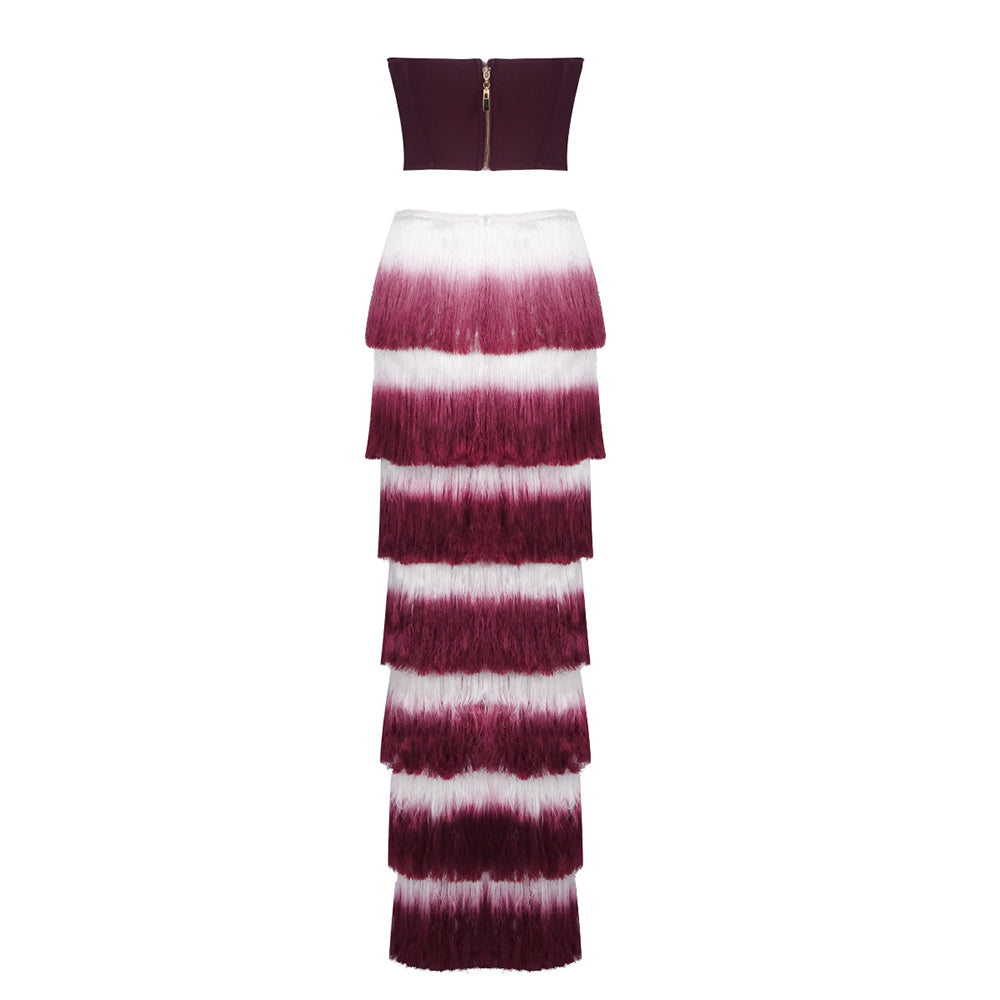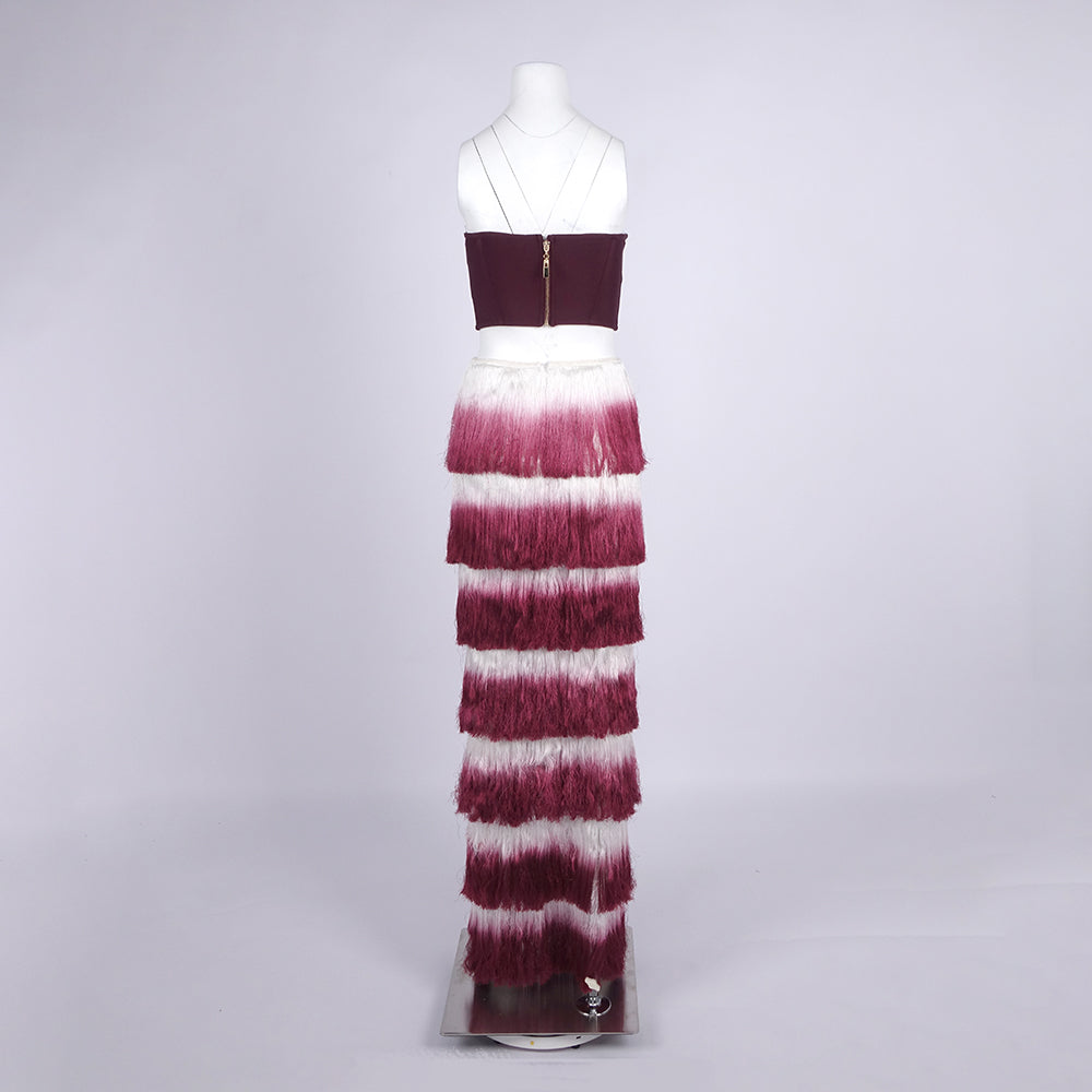 Strapless Tassel Two Piece Maxi Dress Burgundy