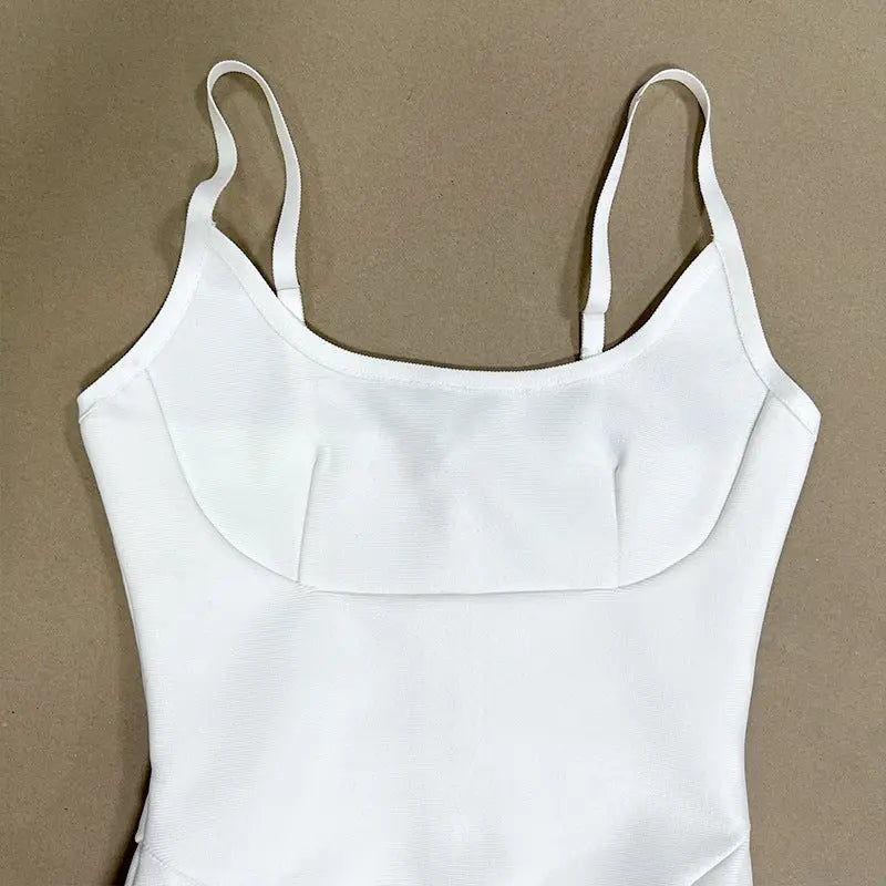 WHITE STRAPPY FEATHER MIDI BANDAGE DRESS