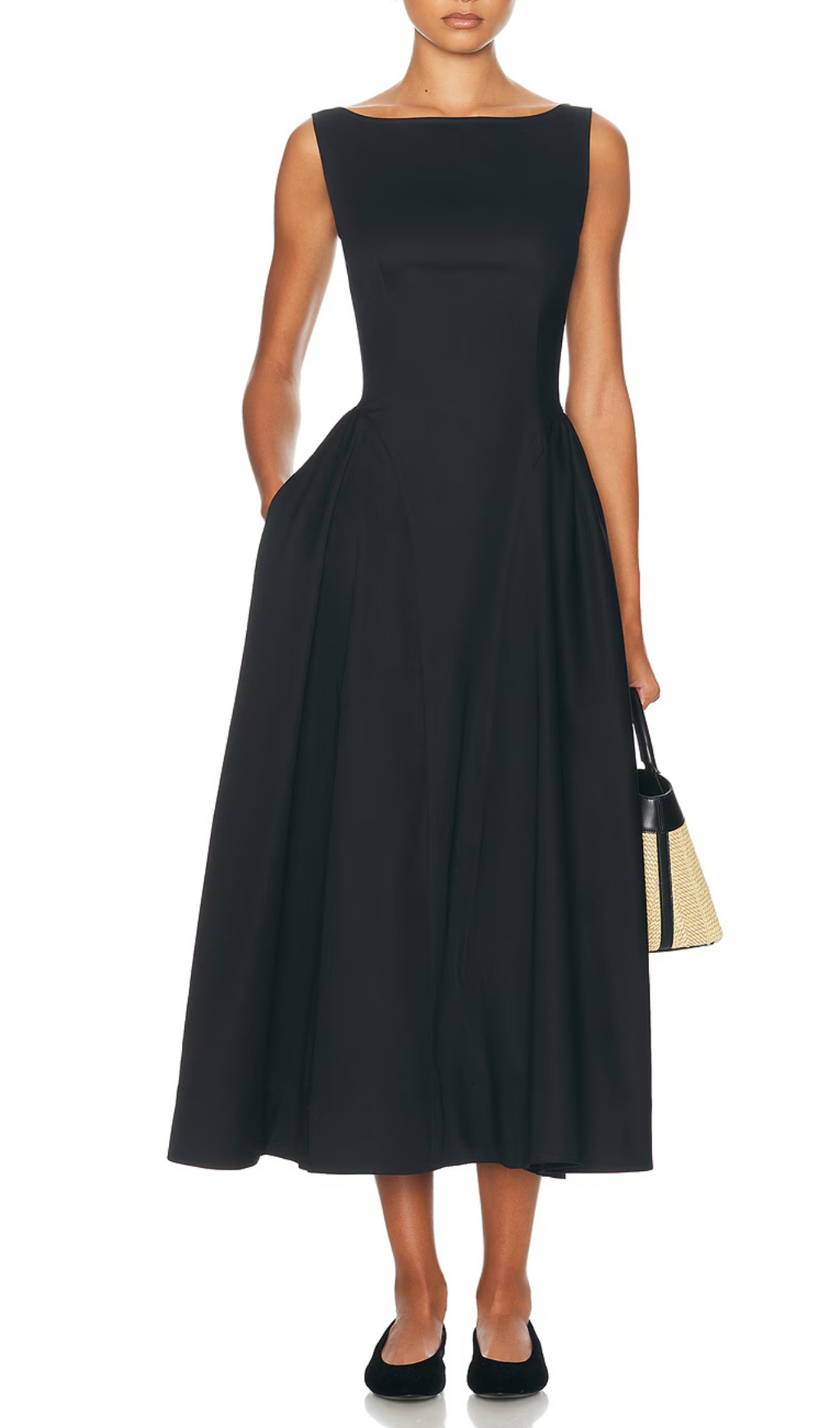 Stretch Cotton Sateen Midi Dress in black