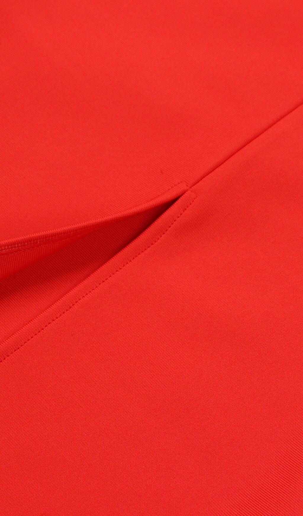 STRETCH STRAPLESS FEATHER TRIMMED GOWN IN RED