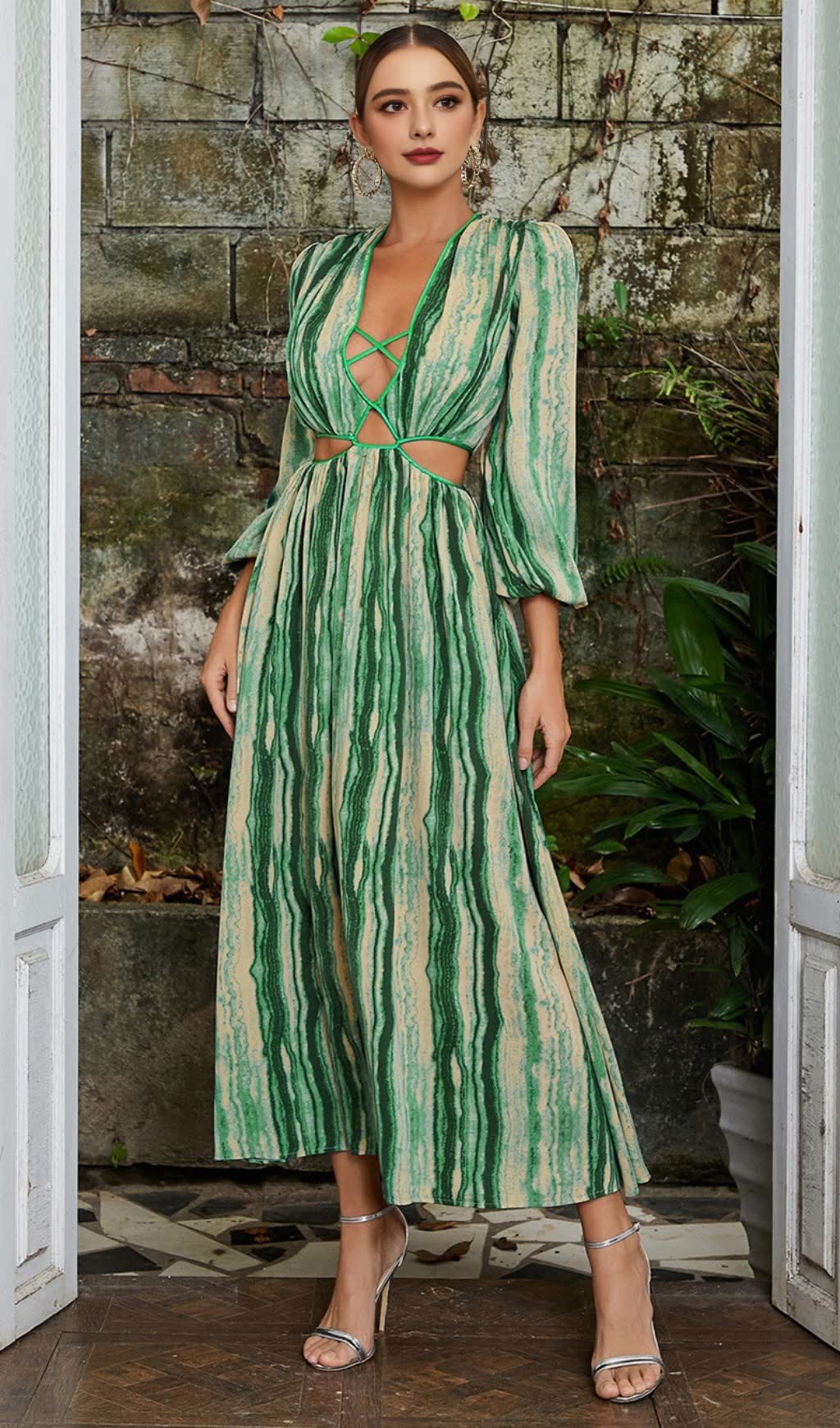 This dress features green and beige stripes, a deep V - neck, cutout details, and puff sleeves. The flowing maxi silhouette is eye - catching. Ideal for ��holiday break dress to impress�� gatherings, as ��hoco dress inspo�� for homecoming, or a ��bohemian dress�� - inspired event. Its unique, stylish design lets you ��dress to impress�� with confidence, perfect for formal events, outdoor parties, or special outings to shine.