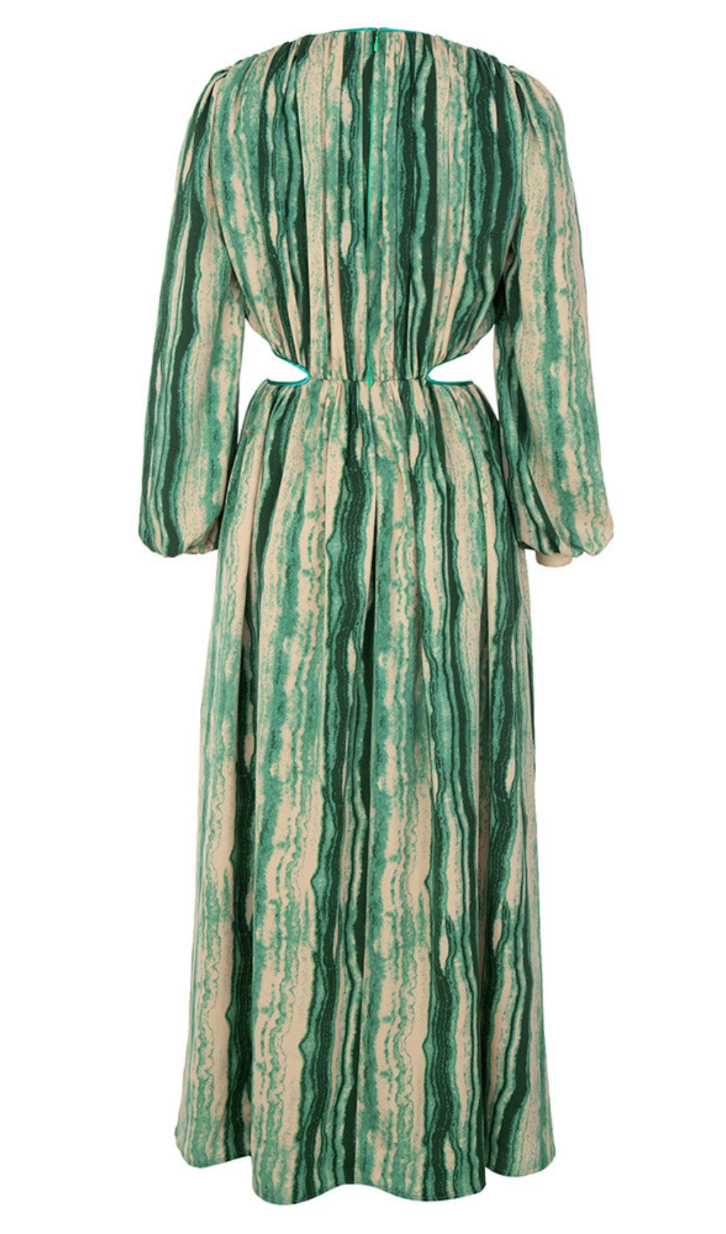 Striped Cutout V - Neck Puff - Sleeve Maxi Dress in Green