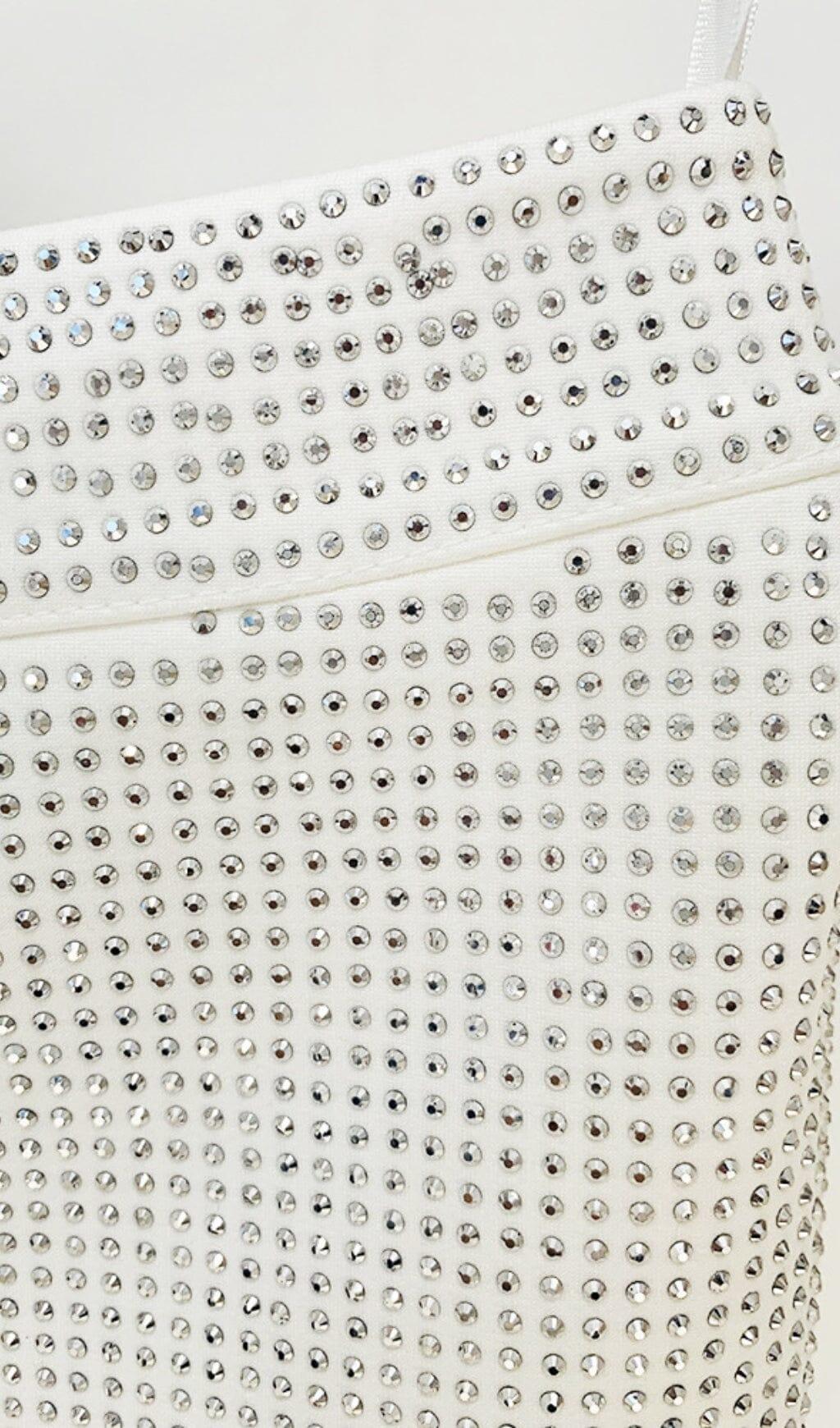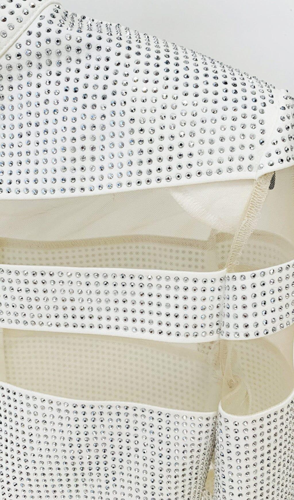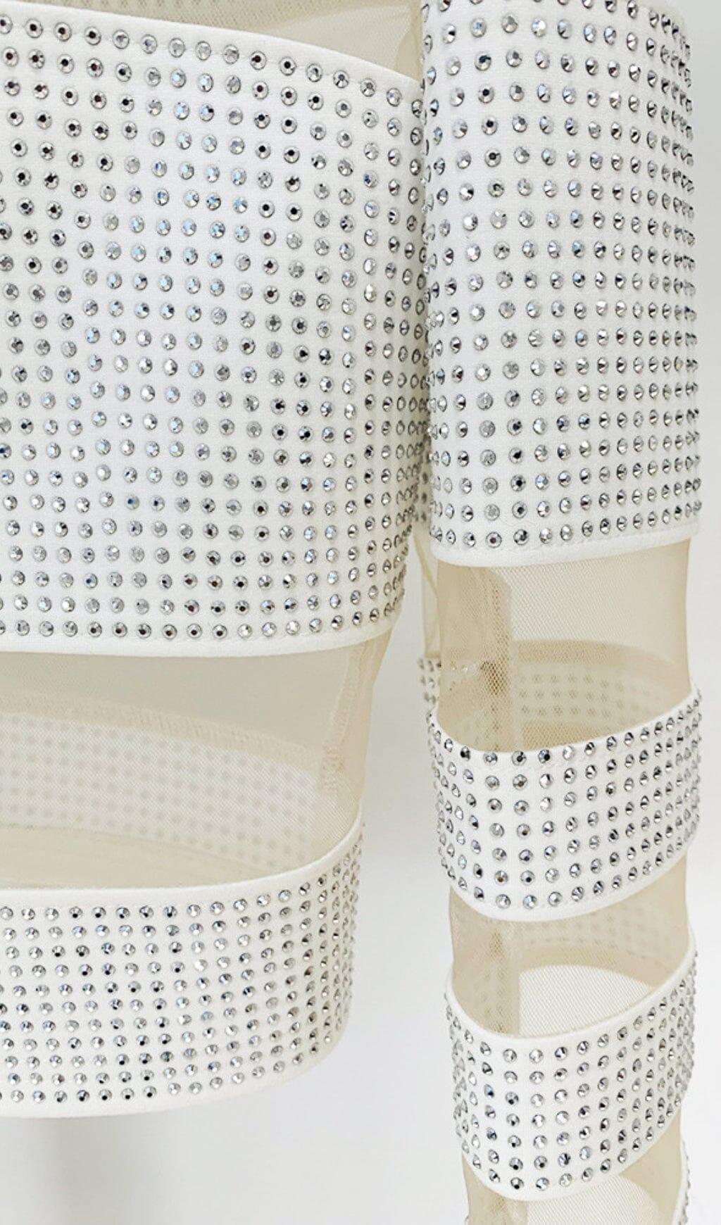• High-shine rhinestone stripes illuminate the crop top and mini dress