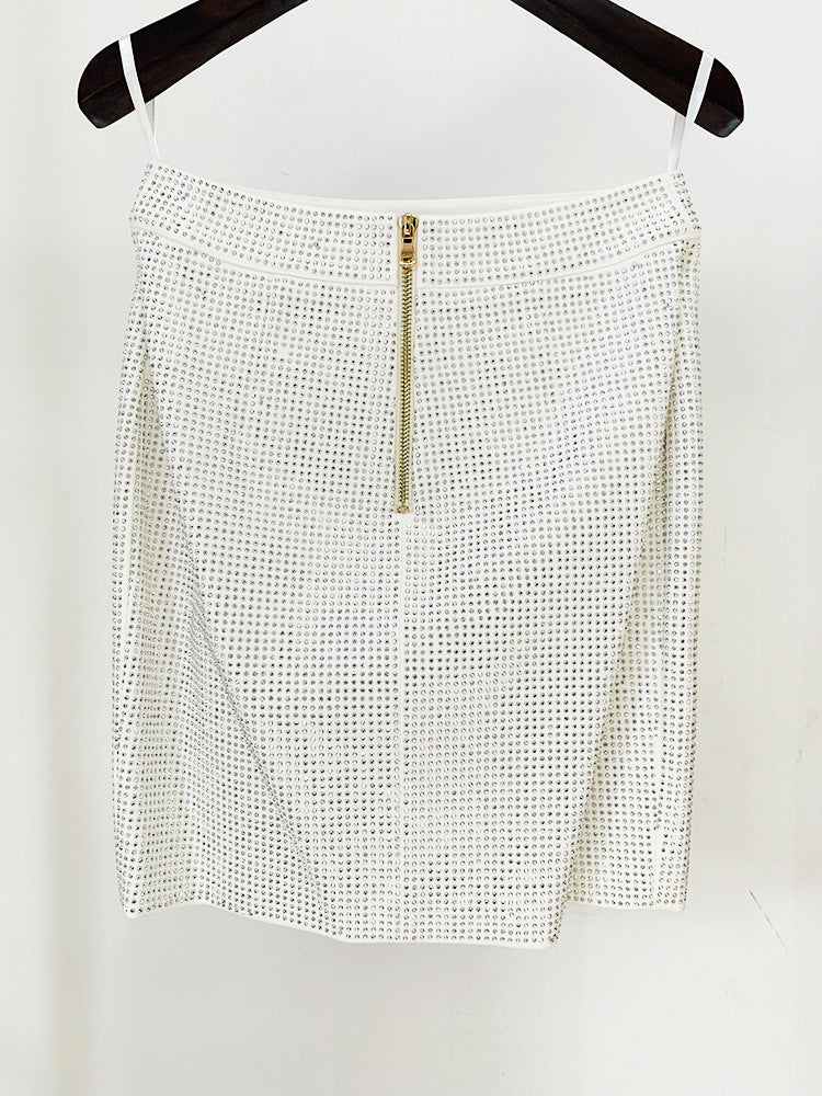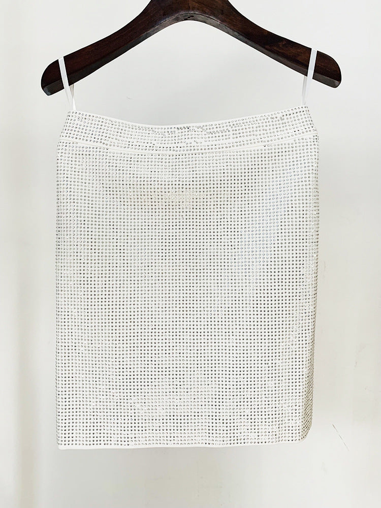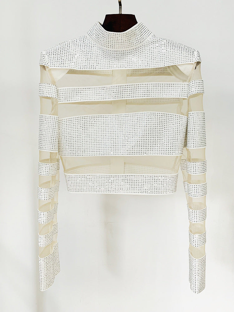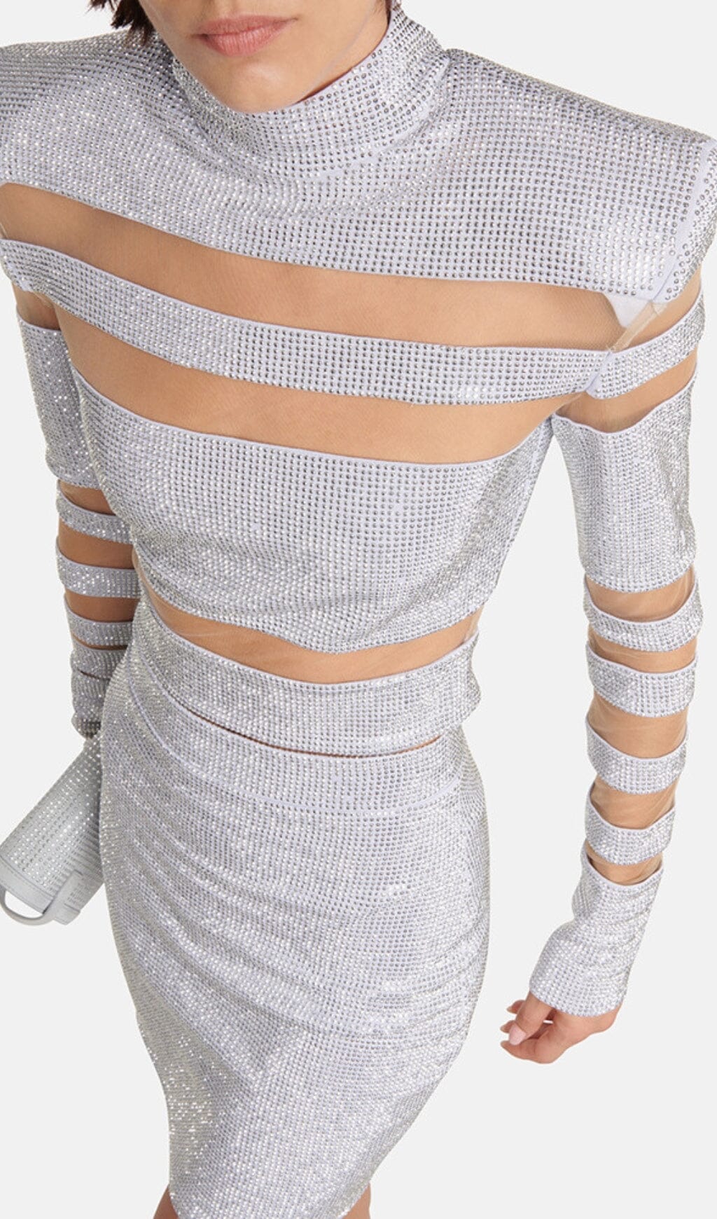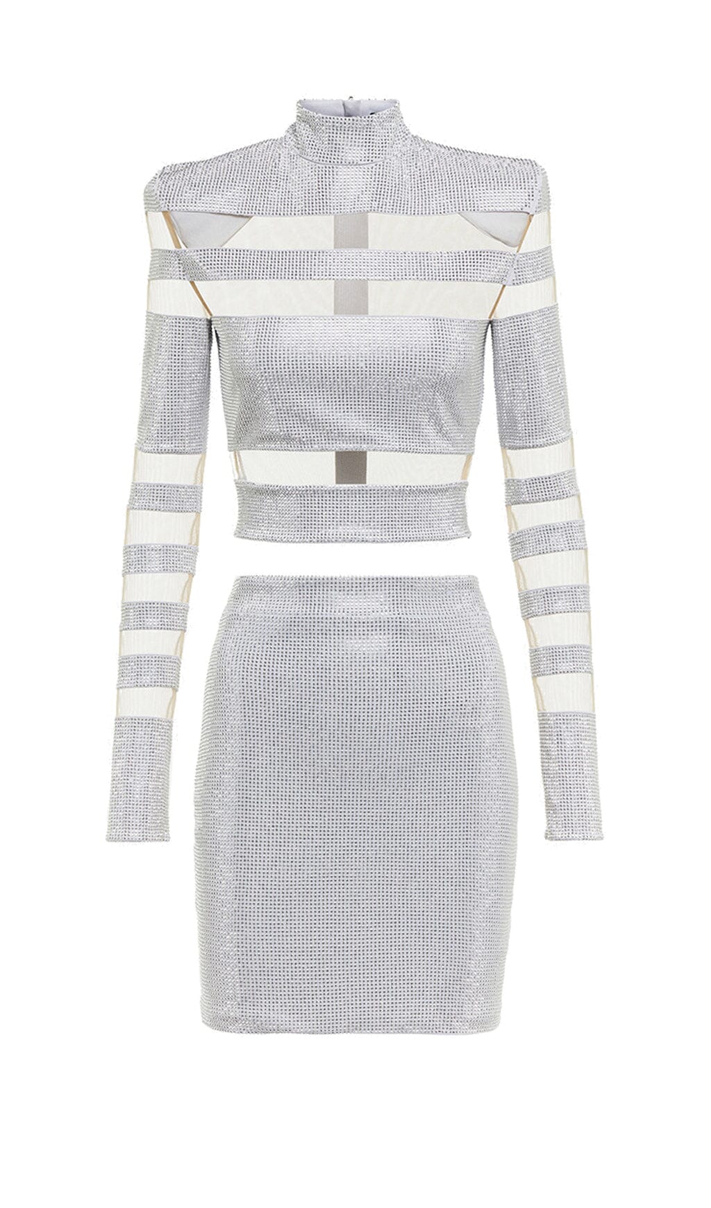 Shine bright in this striped rhinestone two piece set in silver. High-shine rhinestone stripes illuminate the crop top and mini dress. Skin-baring cutouts provide an alluring peek of skin when you need that extra sparkle.