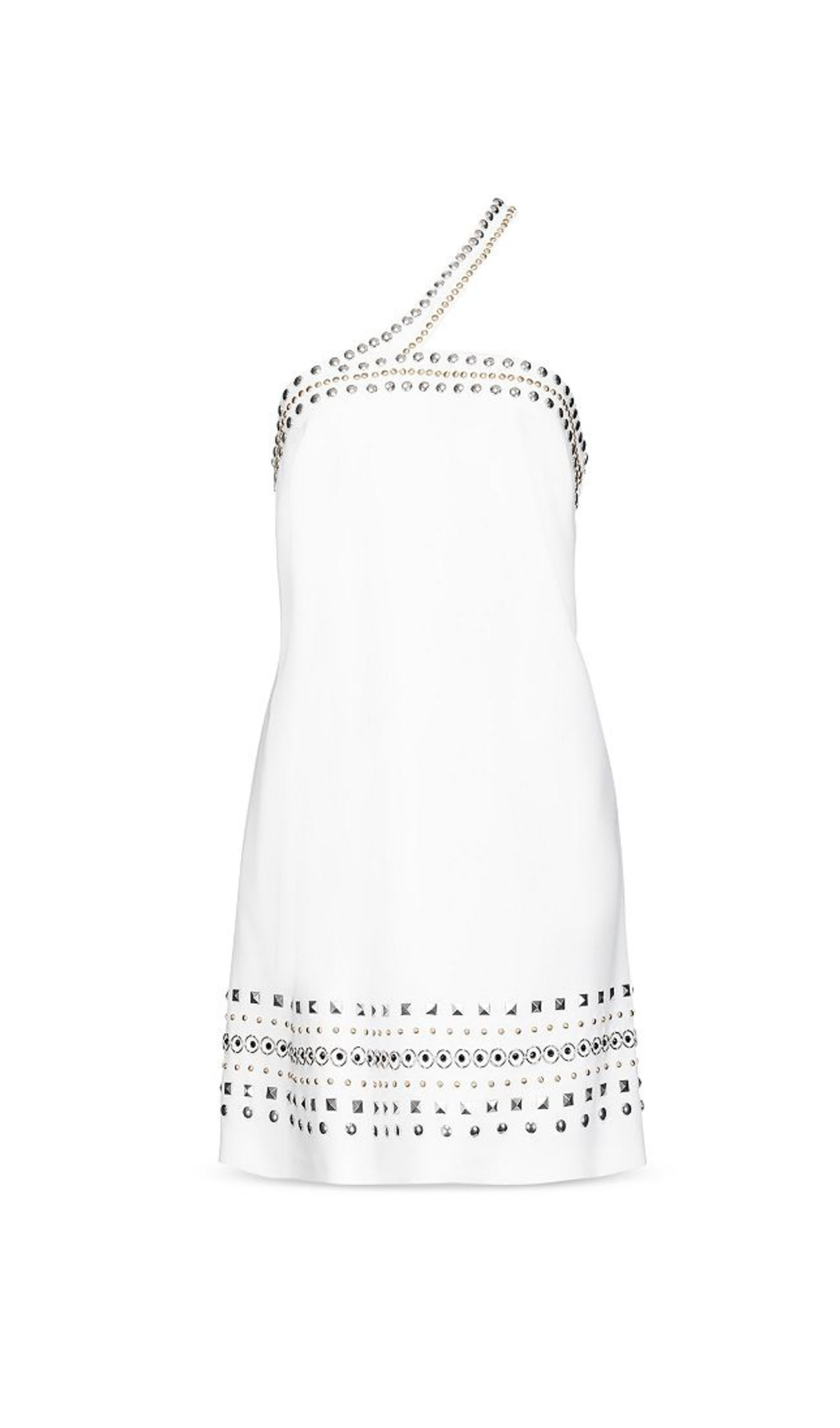 This Studded embellished Mini Dress in white is expertly crafted with intricate studded embellishments, creating a stunning and unique design. Made with high-quality materials, this dress offers both style and comfort. Elevate any occasion with this chic and fashionable dress.