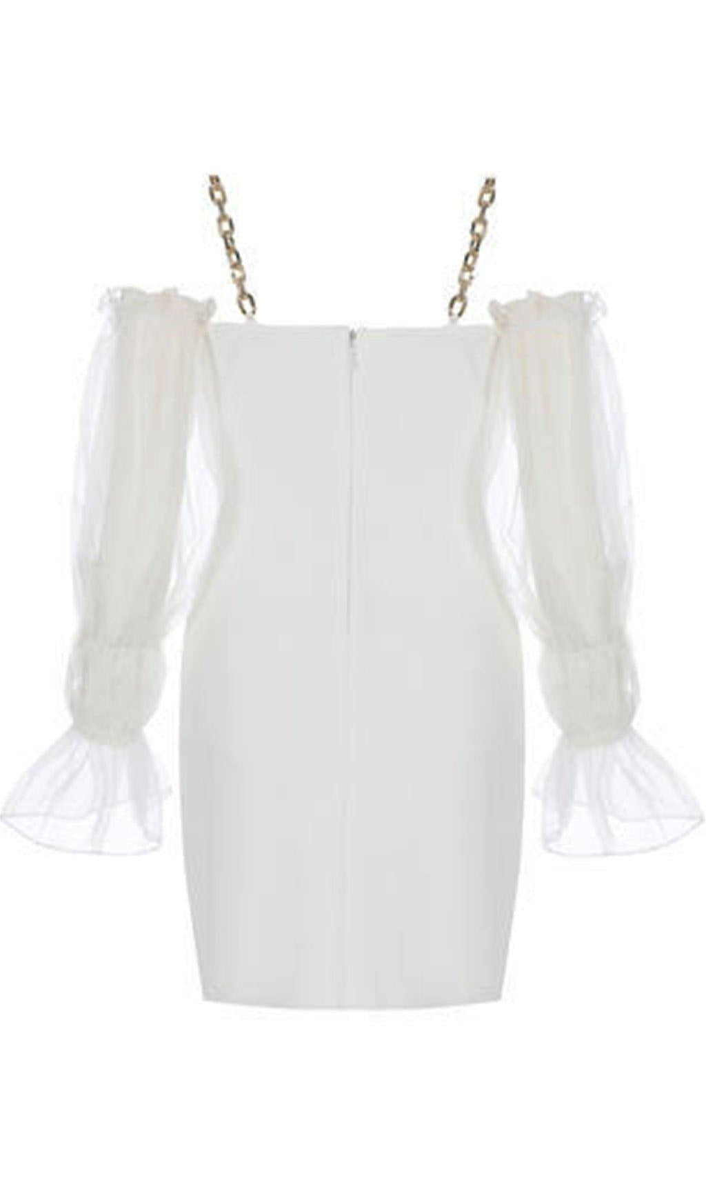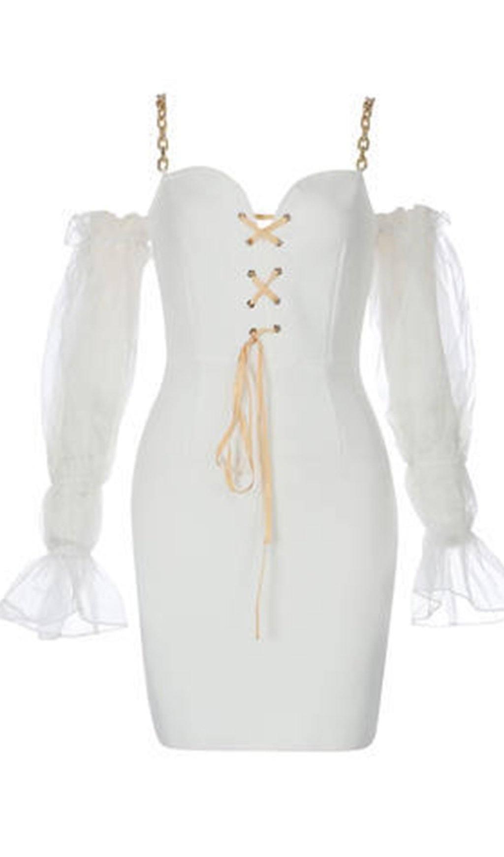 Add a touch of elegance and allure to your wardrobe with our Ivory Lace Up Mini Dress. This dress features a low neckline sling design, with intertwined straps that shape the upper body beautifully. The sleeves are made of delicate lace, creating a fluffy and feminine look. The inner layer is lined with elastic woven fabric, ensuring a secure and comfortable fit.