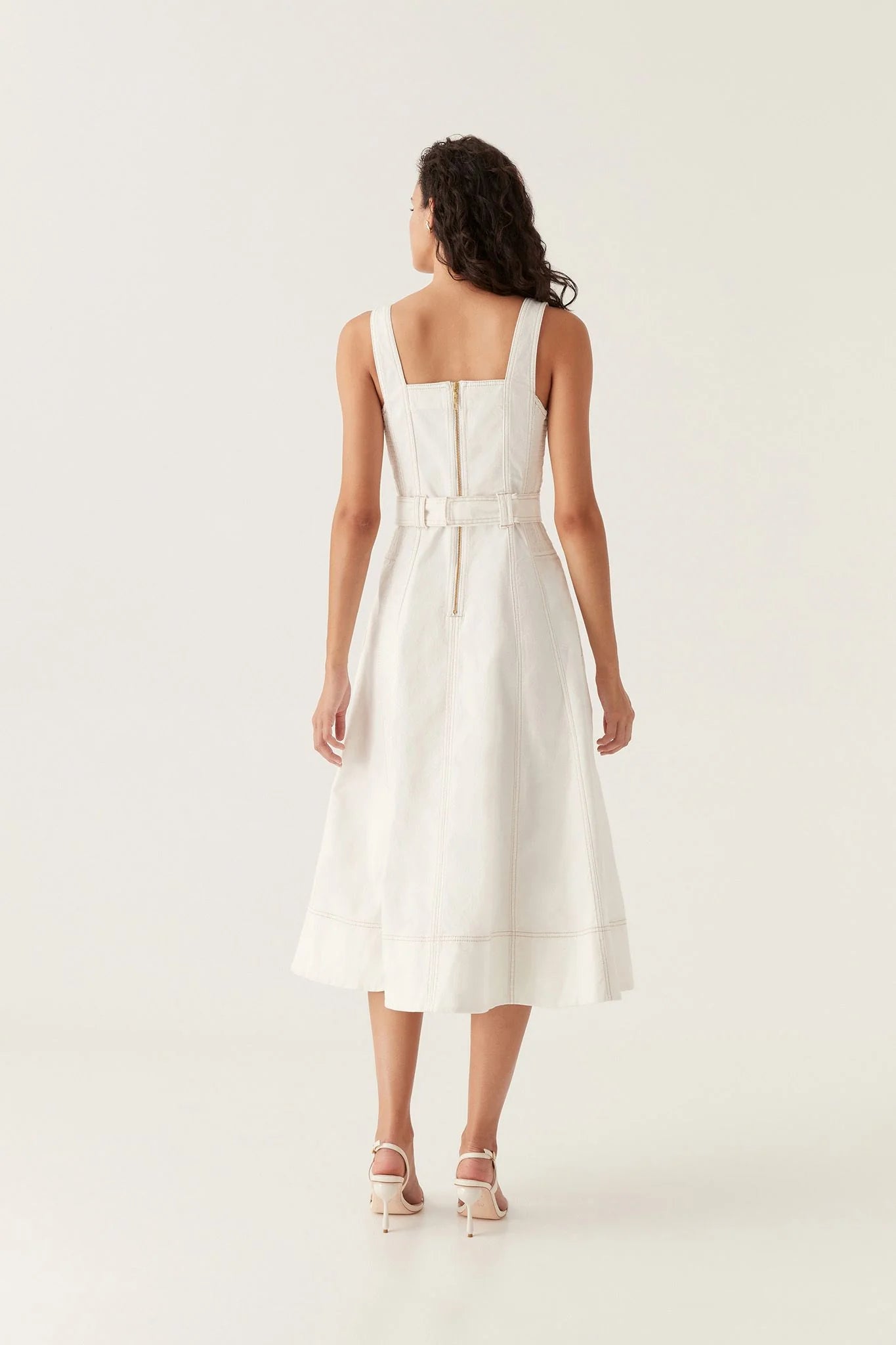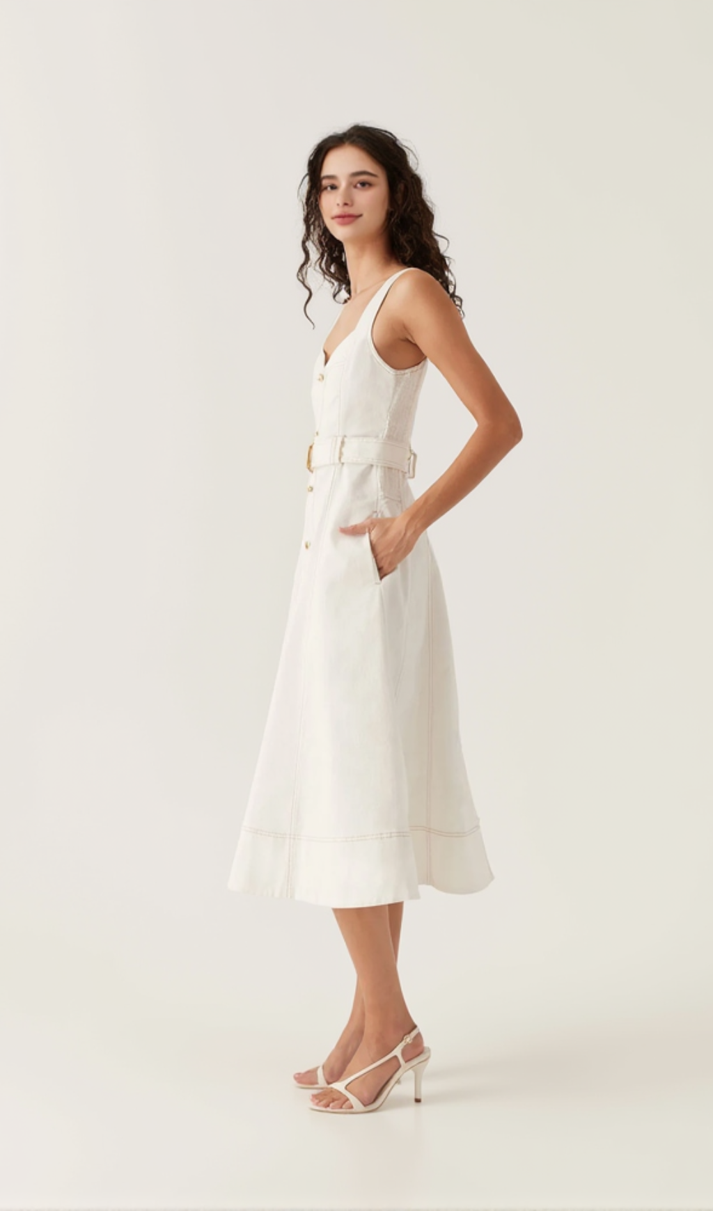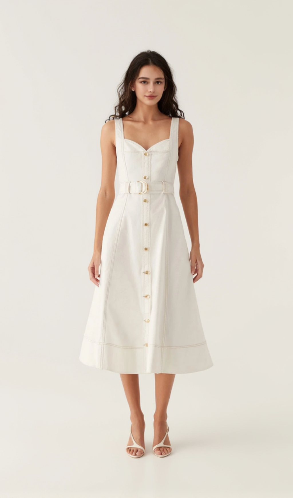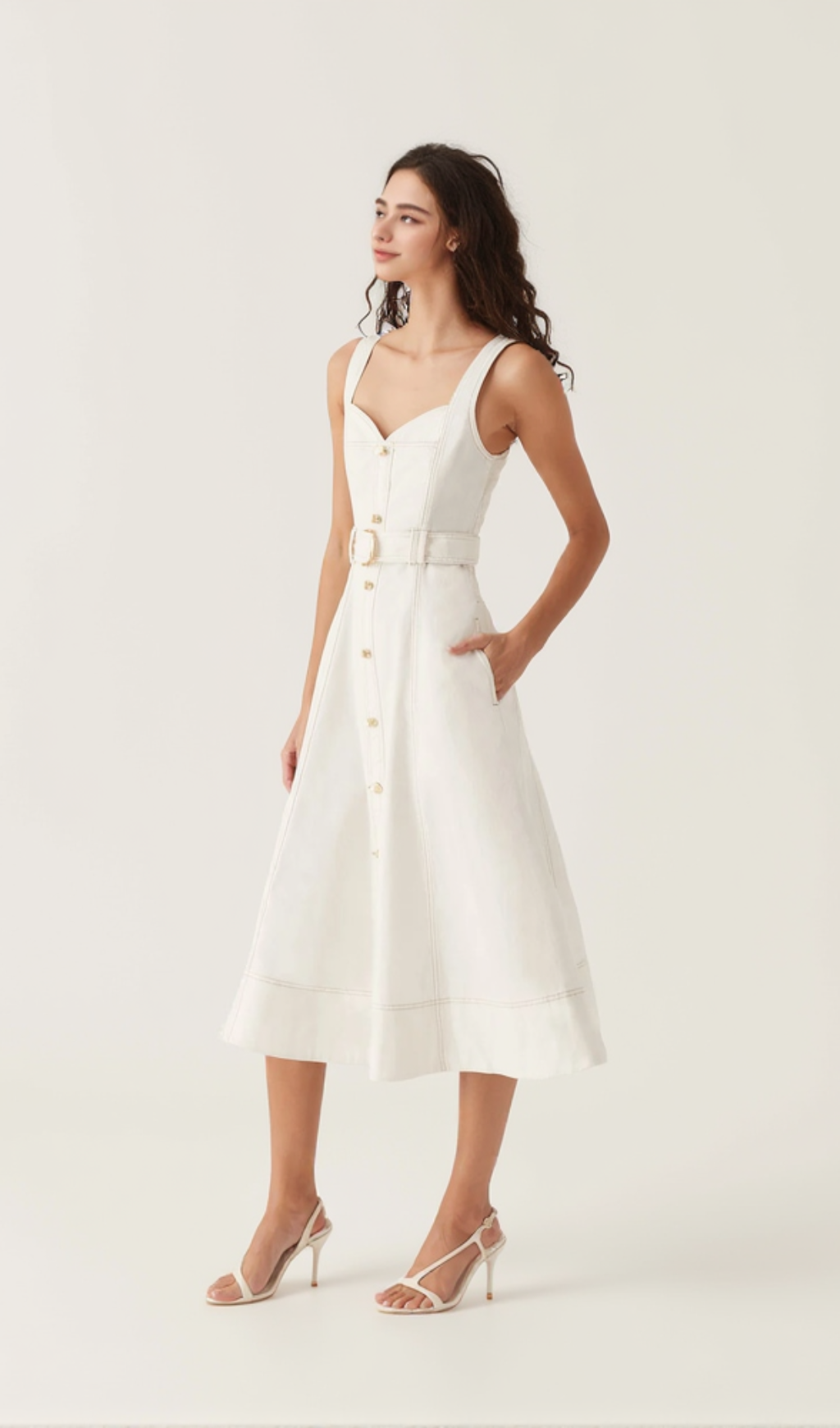 This ivory sweetheart neckline dress features a flattering belted waist and comfortable midi length, creating a sophisticated and elegant look. Perfect for any special occasion, this dress will make you feel confident and stylish. Enjoy the timeless beauty and versatility of this must-have piece.