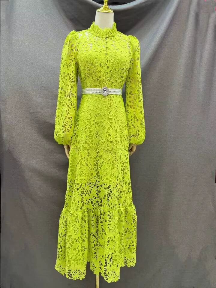 TARA GREEN LACE EMBROIDERED LONG SLEEVE MIDI DRESS