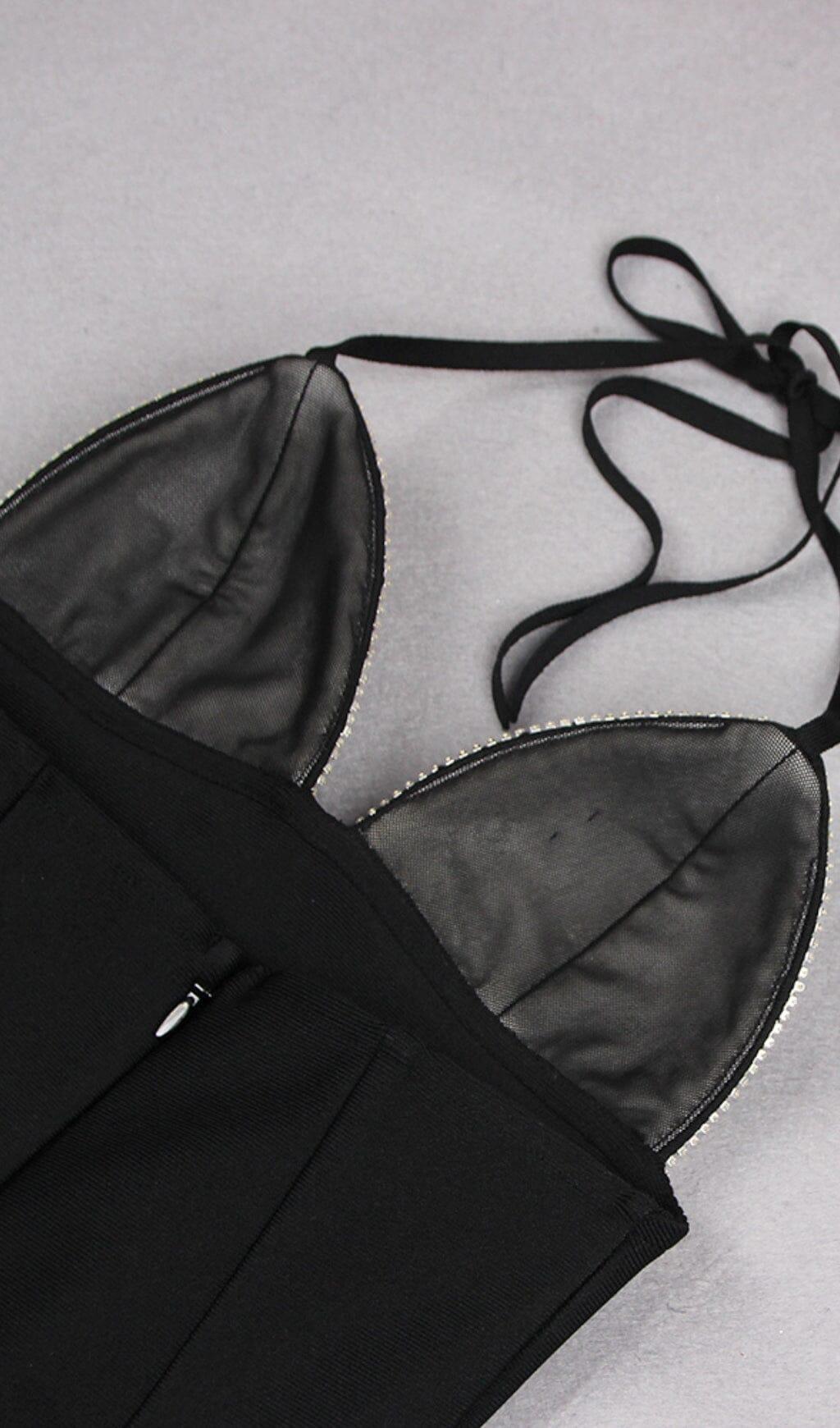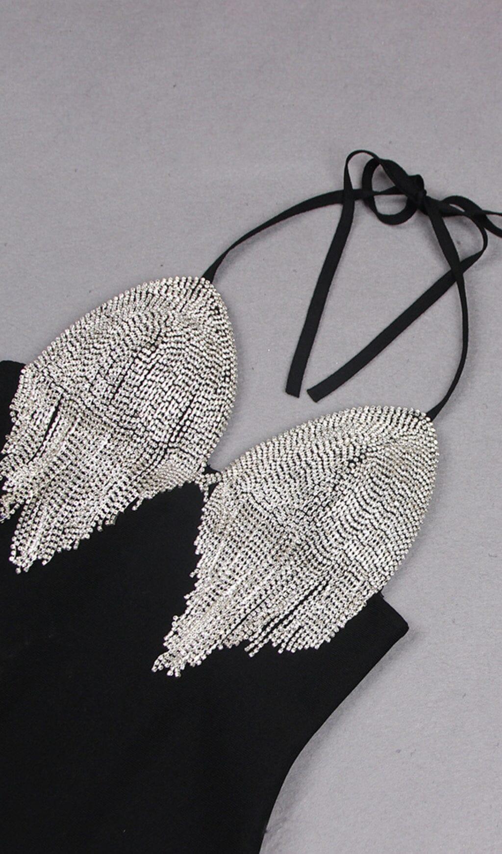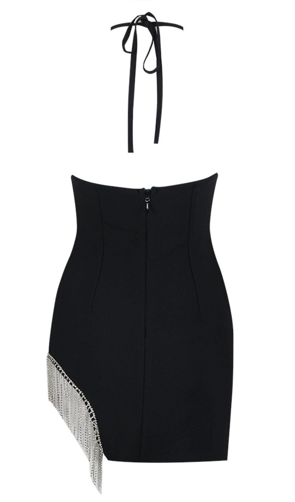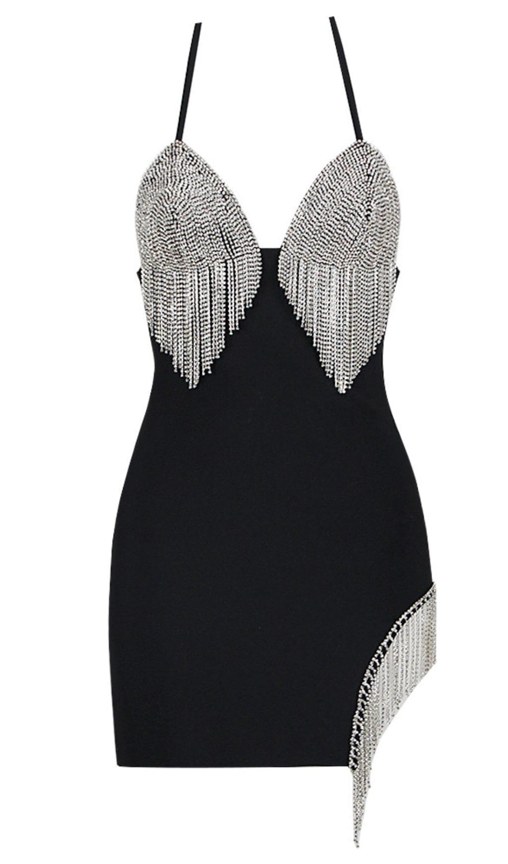 TASSEL PLUNGE MINI DRESS IN BLACK