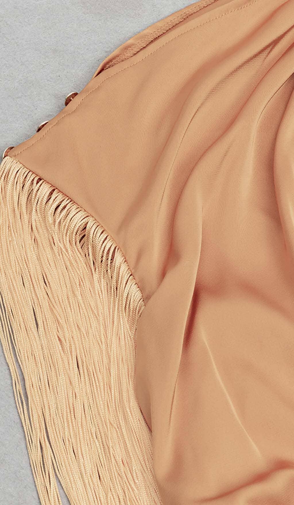 TASSEL SLEEVE SATIN MIDI DRESS IN BROWN