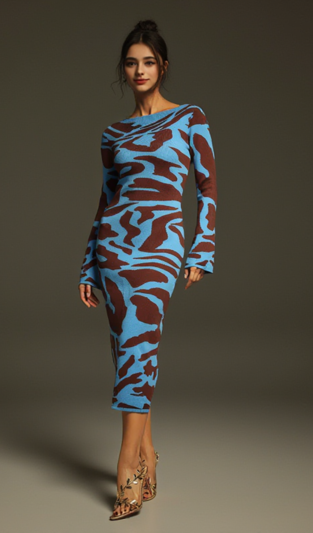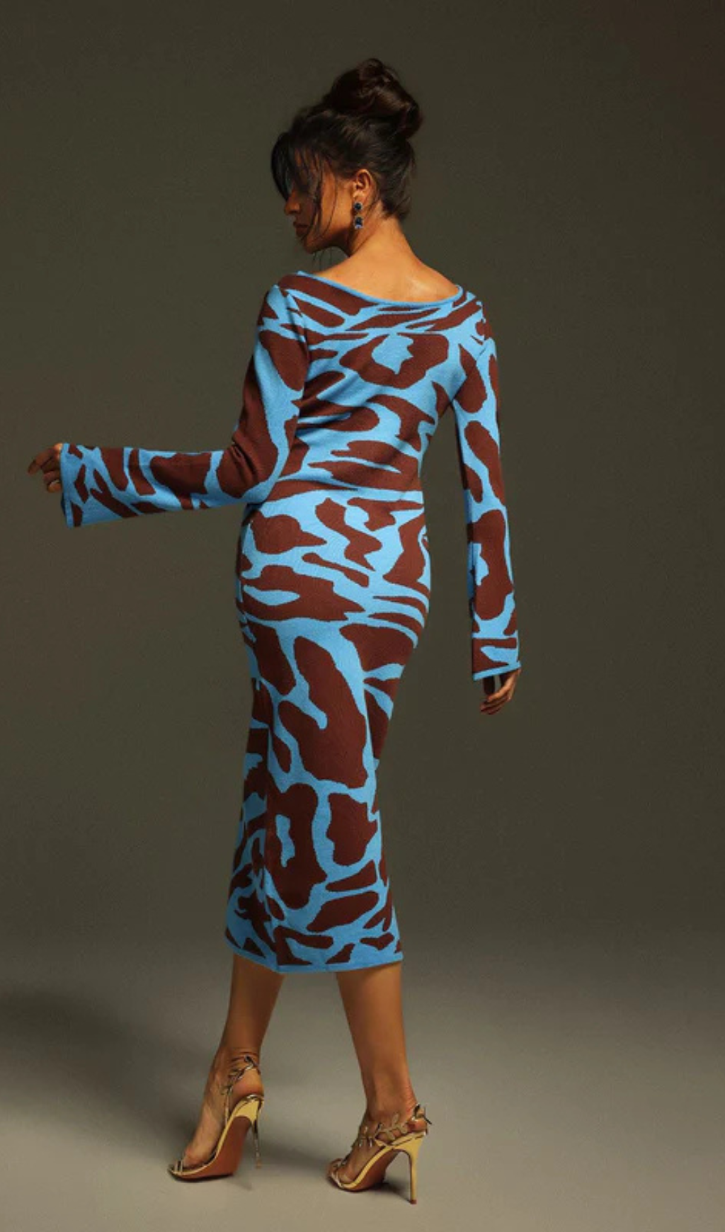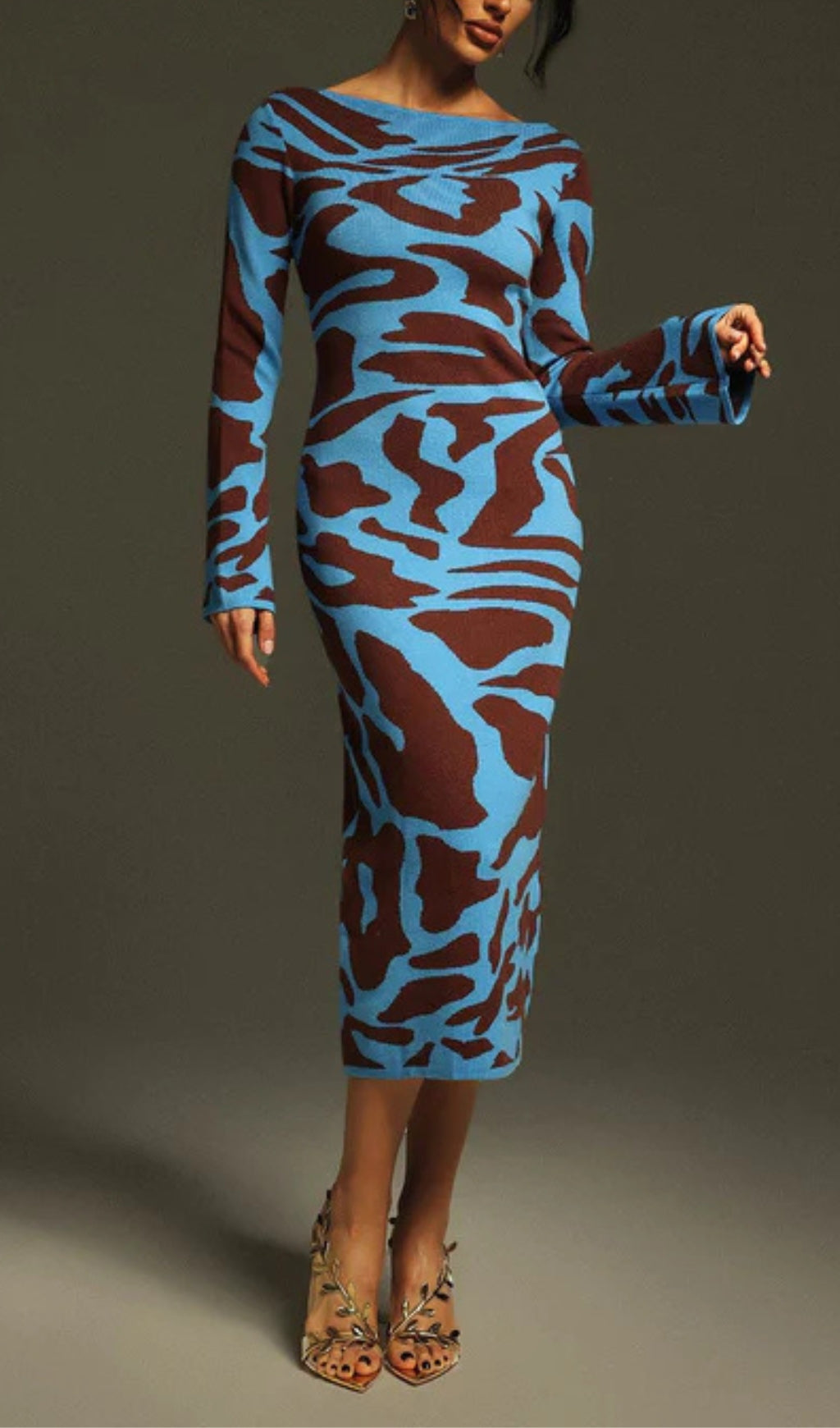 TAYSIA LONG SLEEVE LEOPARD KNITTED MIDI DRESS