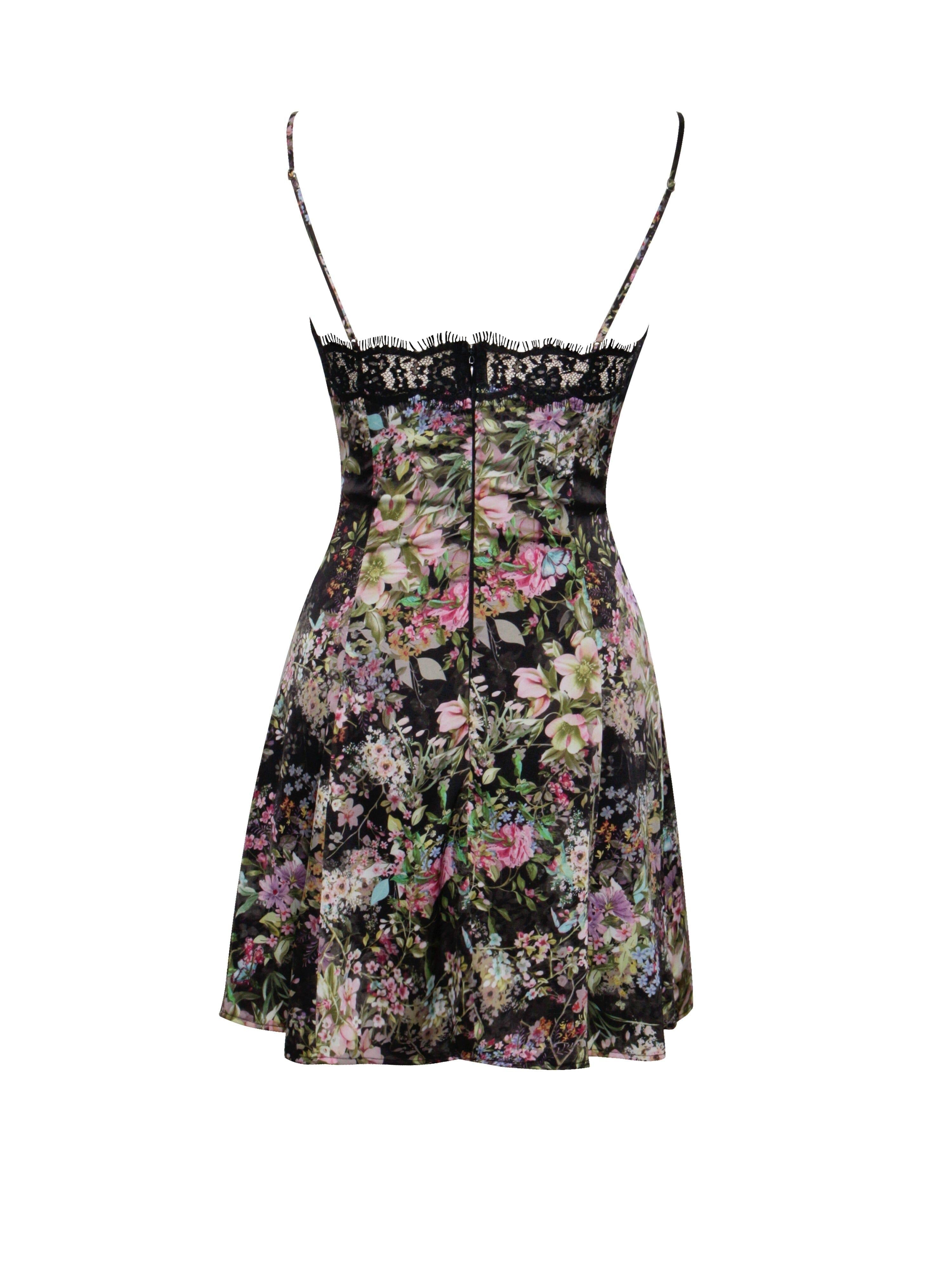 FLORAL PRINT SATIN MINI DRESS WITH LACE TRIM