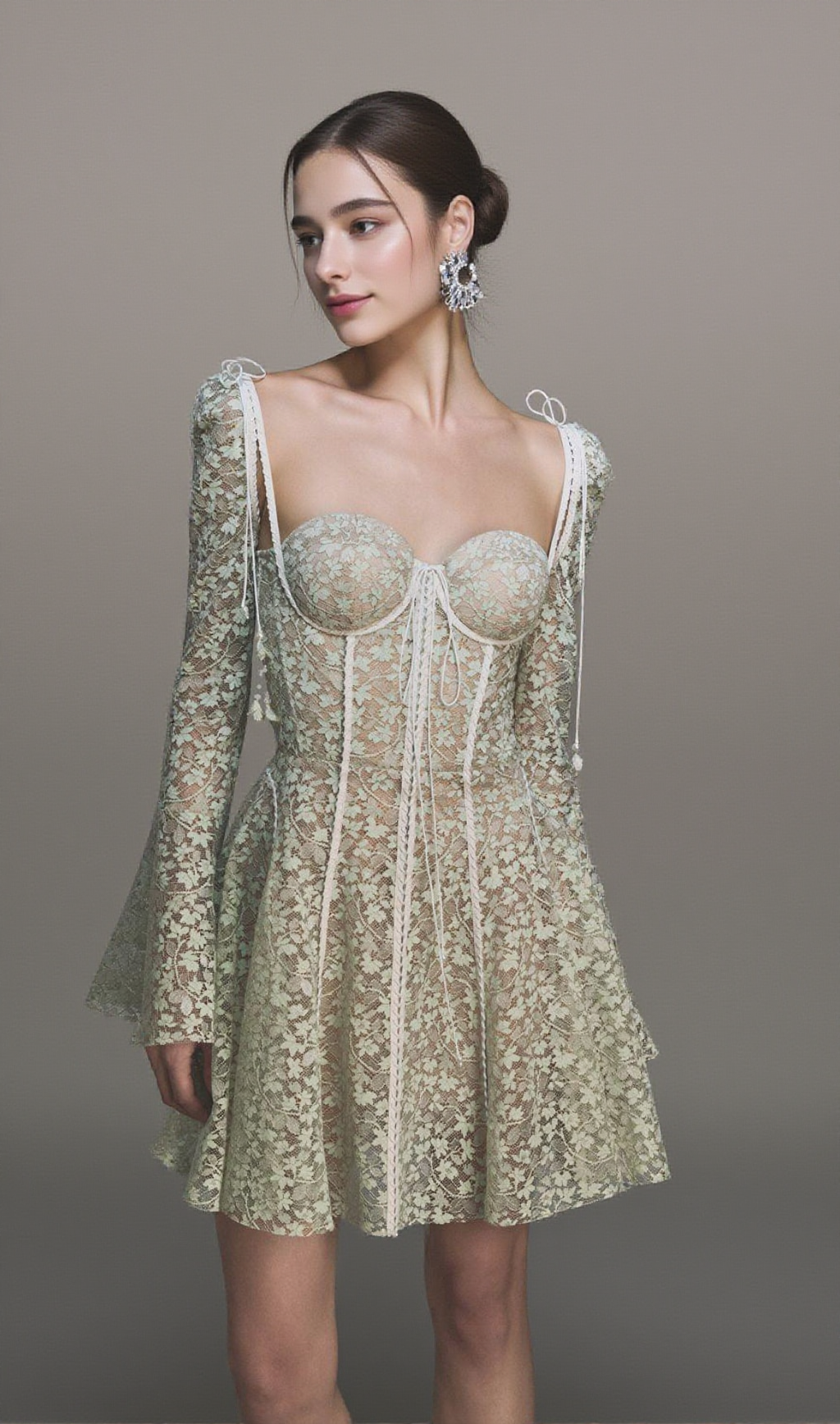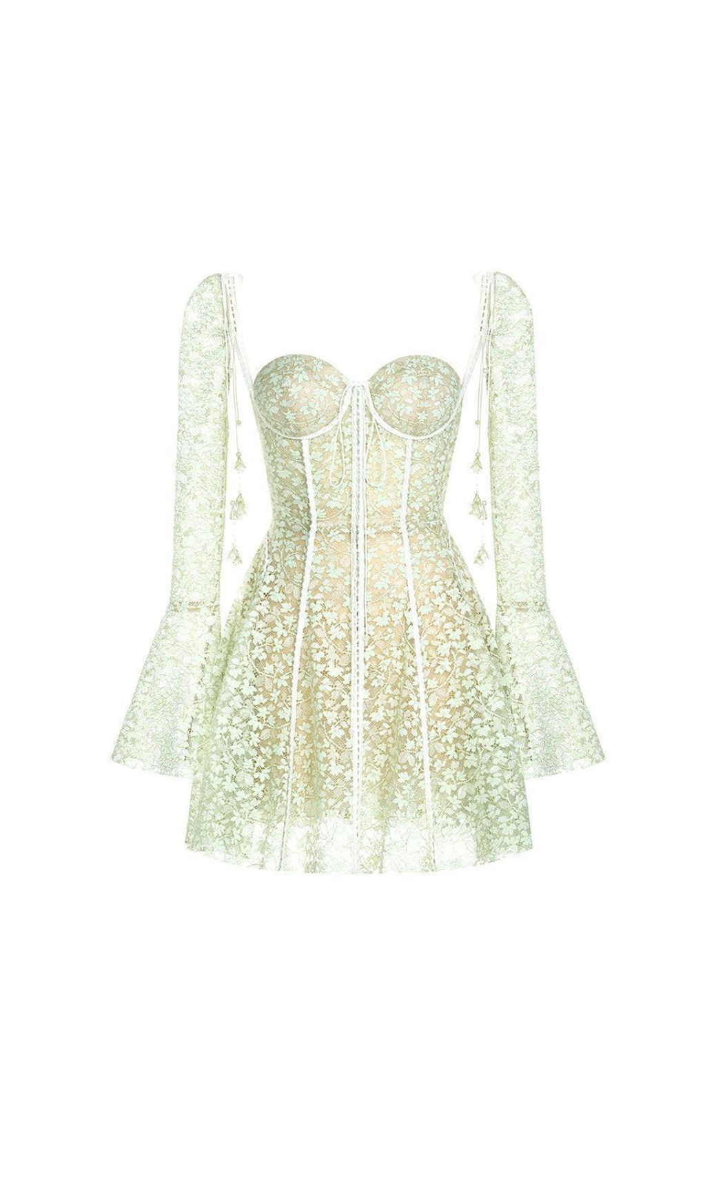 TERESA TRUMPET SLEEVE LACE EMBROIDERY MINI DRESS IN GREEN