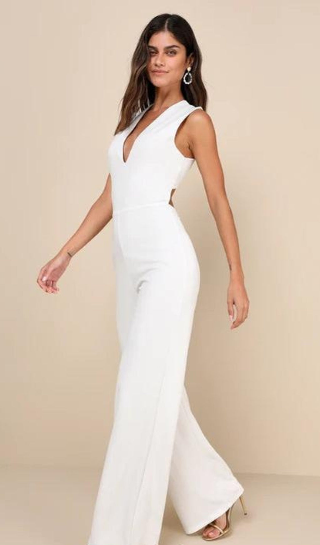 This easy-wearing jumpsuit gives effortless glamour as it flaunts a plunging, sleeveless bodice with wide straps that crisscross the sexy backless design. The wide-leg silhouette completes the sleek and stylish silhouette. Elastic at back.